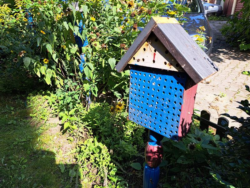 W skrajnej części ogrodu wzrok przyciąga mała skrzyneczka umieszczona na słupku. Pan Franciszek wyjaśnia, że to domek dla pszczół murarek, które inaczej są zwane murarkami ogrodowymi. W otworach drewnianej ścianki wyraźnie widać żółtawy pyłek - to pokarm dla larw, które wykluwają się w domku. Pszczoły murarki to owady bardzo użyteczne, jeśli chodzi o ogród. Ich rolą jest zapylanie kwiatów.