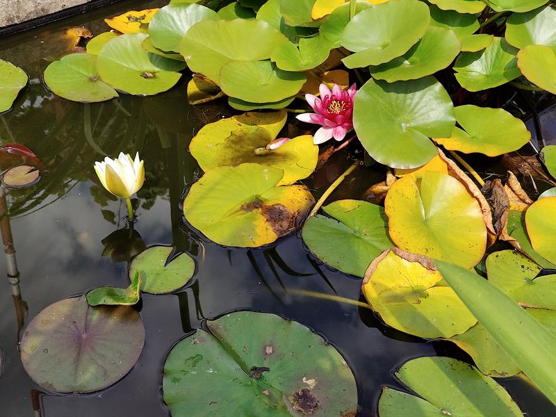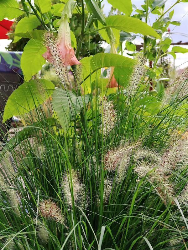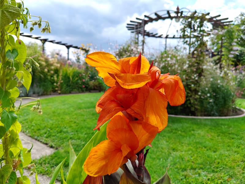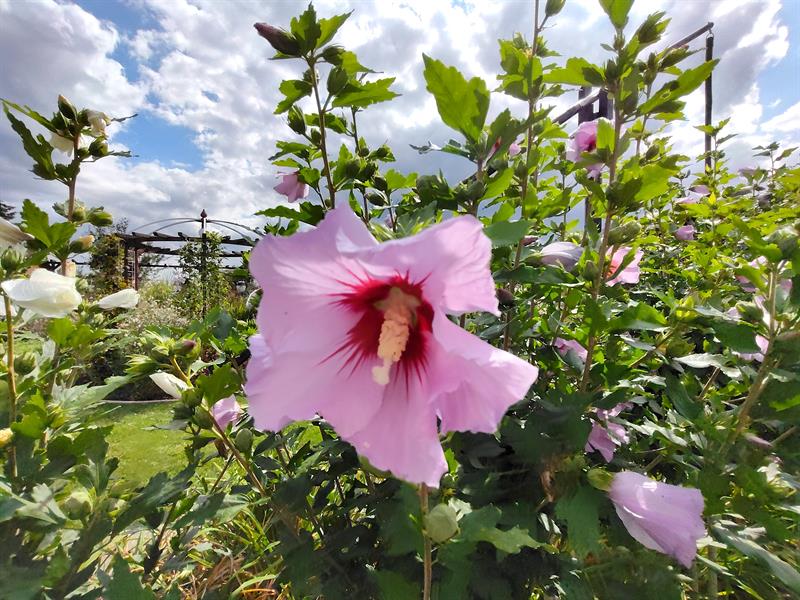 Po pergolach pną się clematisy. W oczku wodnym kwitną lilie wodne, dając cień m.in. czerwonym karasiom. Uwagę przyciągają bujnie kwitnące hibiskusy oraz szumiąca „ściana" miskantów chińskich, zebrinusów. Natomiast nad kwietnikami zaaranżowanymi oryginalnie, bo na obrysie okręgów, powiewa flaga Dumy Pomorza.