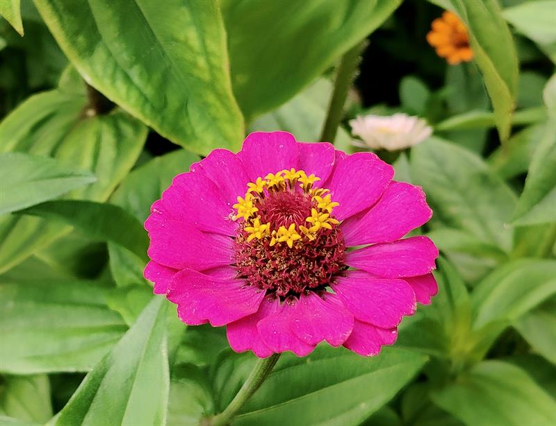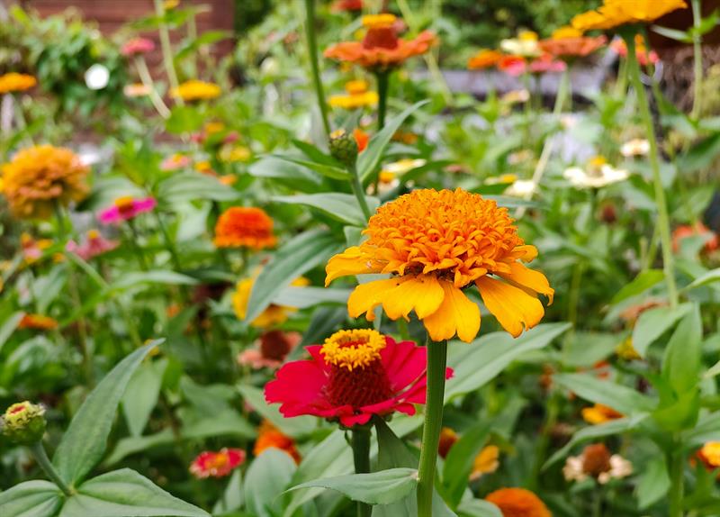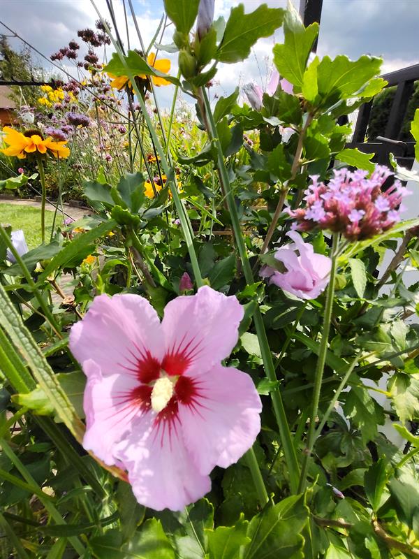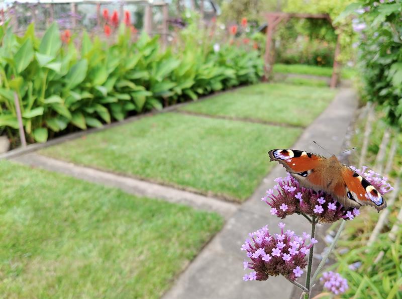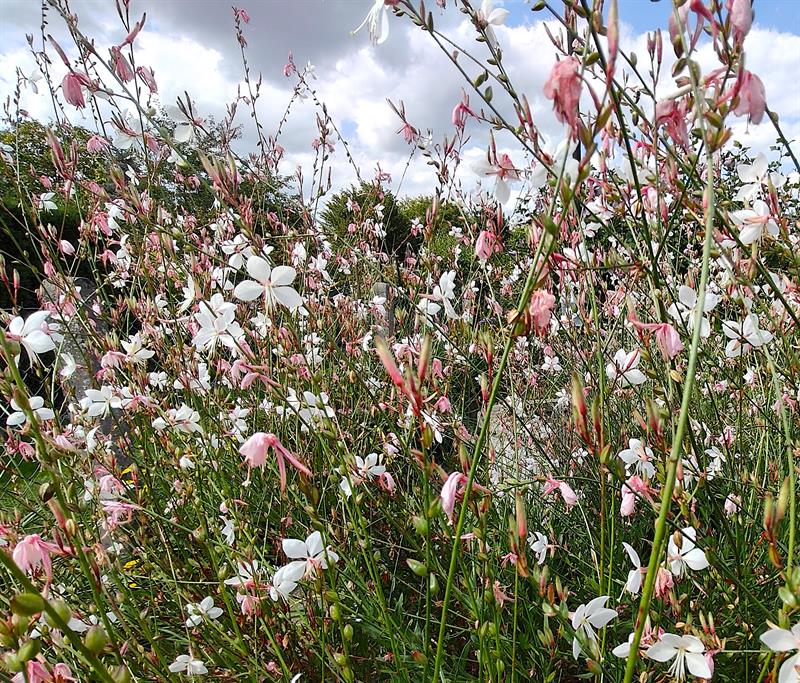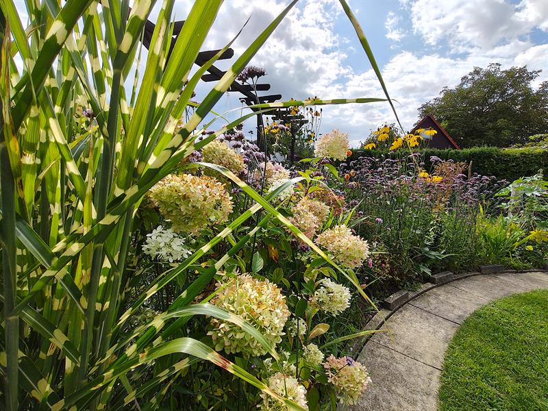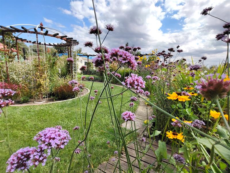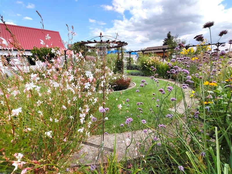 Wokół trawnik także zajmuje obrys okręgu. Przy nim kolejny krąg wyznacza betonowa ścieżka. To granica następnego z okazałych i reprezentacyjnych kwietników, w którym kolorowymi plamami rozkwitają kępy gaury, rudbekii, hortensji bukietowej, szafranków, cynii, dalii, lawendy. Natomiast ponad nimi górują delikatne werbeny patagońskie.