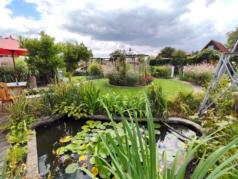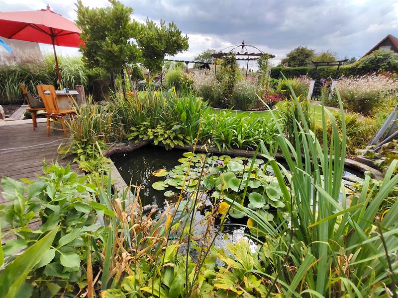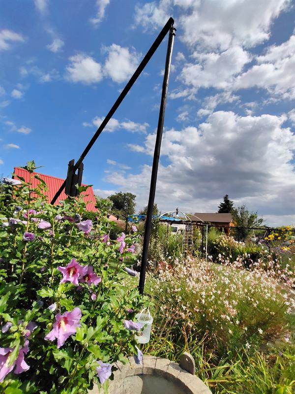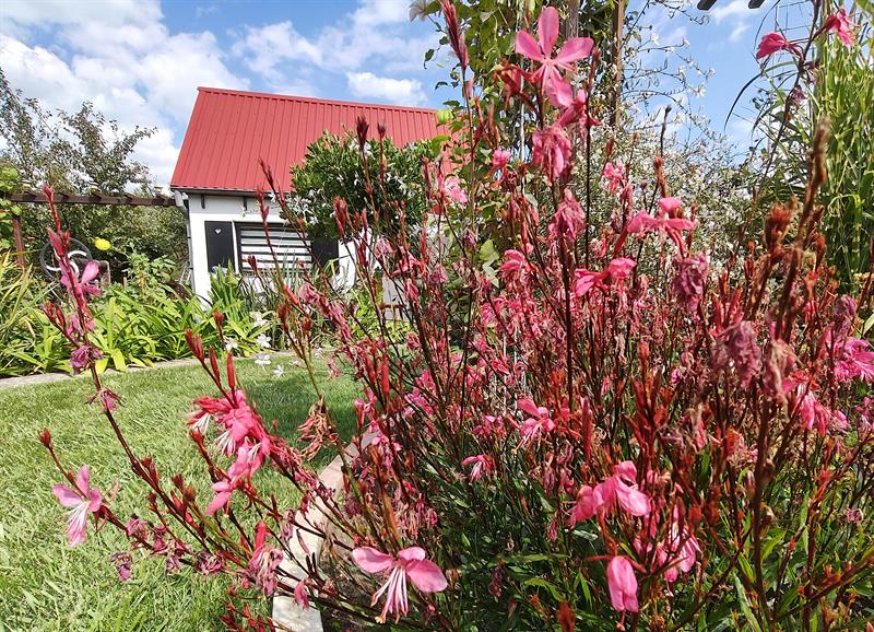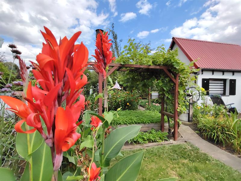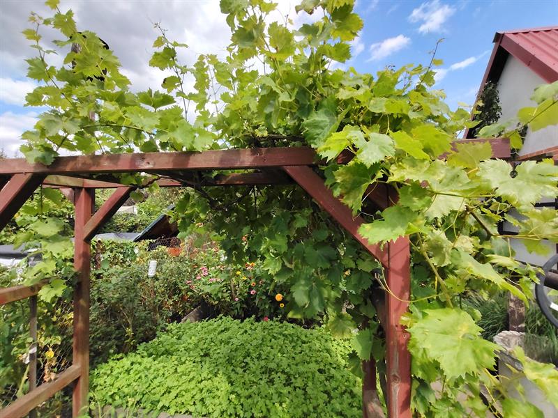 Dalej widać pergole, które zajmują pędy winogron. Osłaniają bardziej użytkową część ogrodu, z warzywnikiem. Natomiast niejako na froncie altany taras okala okazałe oczko wodne z liliami i karasiami: czerwonymi i jednym albinosem. Granice wody zostały „zmiękczone" przez m.in. ozdobne trawy, liliowce, ismeny i hosty. Pewnie dlatego zachęca do wypoczynku nie tylko ludzi, ale przyciąga również rozmaite owady, ptaki, żaby, a nawet zaskrońce.