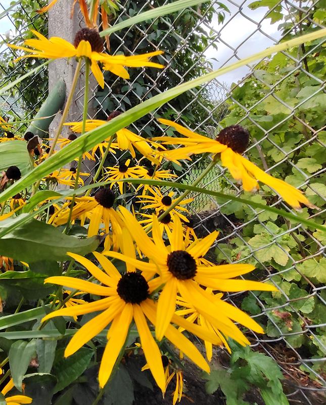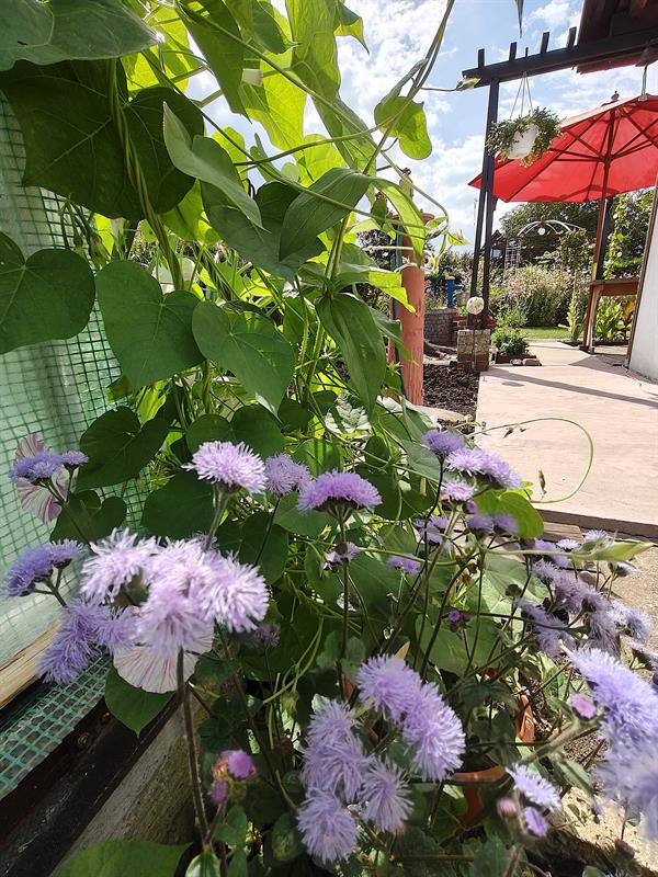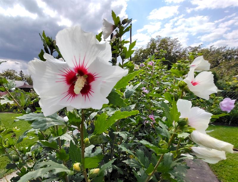 Z jednej strony granicę reprezentacyjnej części ogrodu wyznacza rząd hibiskusów. Wyglądają, jakby były szczepione na pniu. Tymczasem zostały tak oryginalnie przycięte przez p. Henryka, a wyhodowane z nasion zebranych przy szczecińskiej katedrze. Tuż za nimi trawnik został podzielony na równe kwadraty, których geometrię podkreślają betonowe alejki. Tuż przy nich zieloną ścianę tworzą wysokie canny o purpurowych kwiatach.