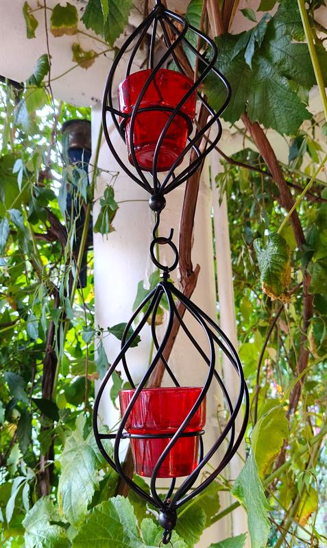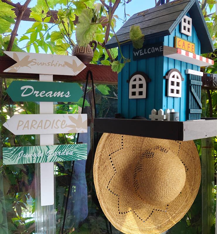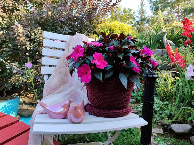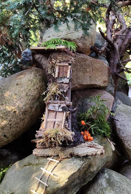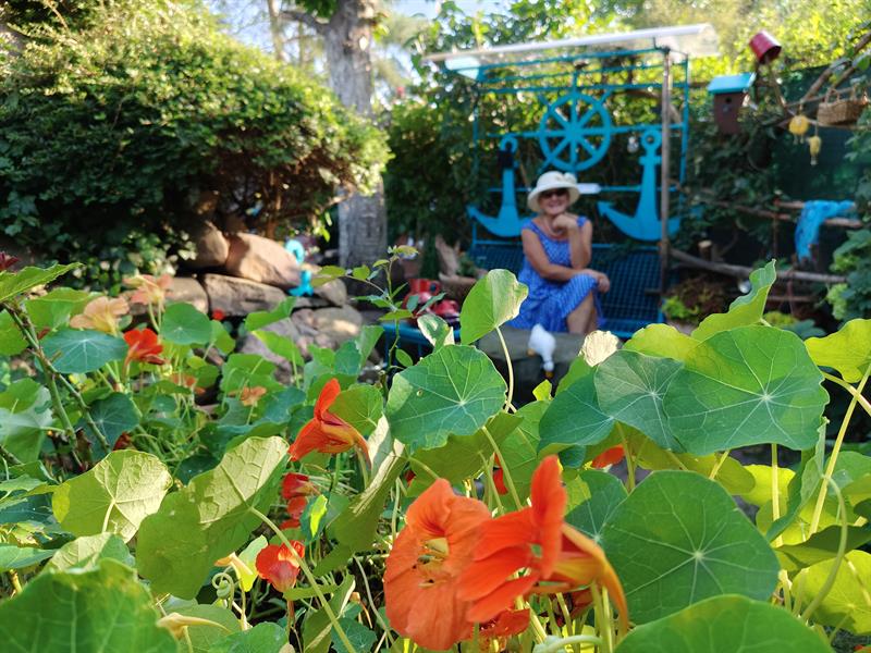 Pozostawiła wszystkie te nietypowe, jak na ogród działkowy, elementy. Wzbogacając je o nowe rośliny i mnóstwo bardzo osobistych elementów dekoracyjnych. Pomiędzy kwiaty i kamienie wplotła nie tylko malowane dzbany i latarnie, ale m.in. również zastawy porcelany i własne szale. Donice ustawiła na siedziskach, a niektóre z nich ubrała w dziergane na drutach ubranka. Altanę odnowiła, dając także jej kominkowi drugie życie. Działkę nazwała i oznaczyła jako „Zaczarowany Ogród". Nie tylko dlatego, że można w nim znaleźć specjalnie przez nią - z wyjątkową dbałością o detale - zbudowane domy dla elfów. Natomiast przy jednym z własnych obrazów wyeksponowała niezwykle dla niej ważne motto: „Żyj swoim życiem... Dzikim i wolnym".