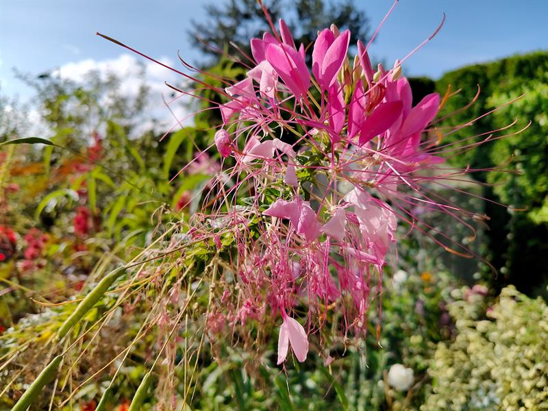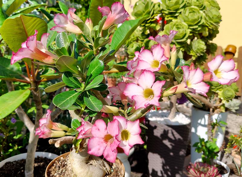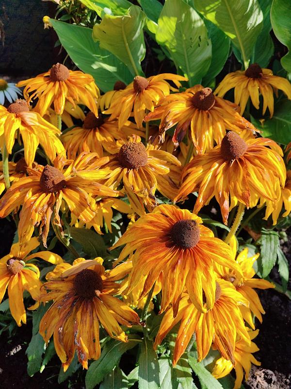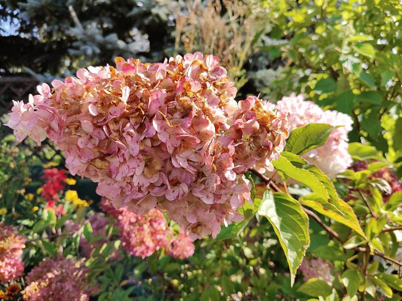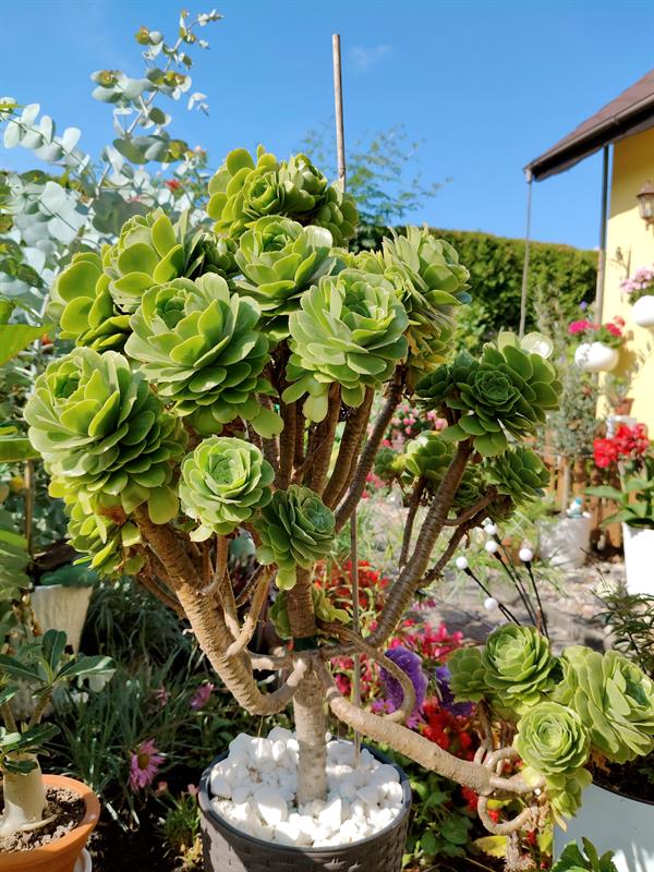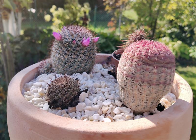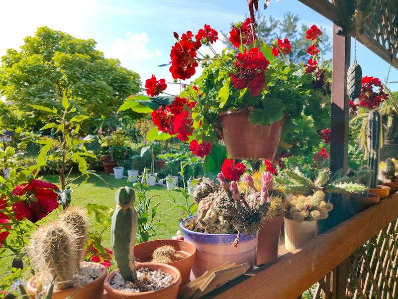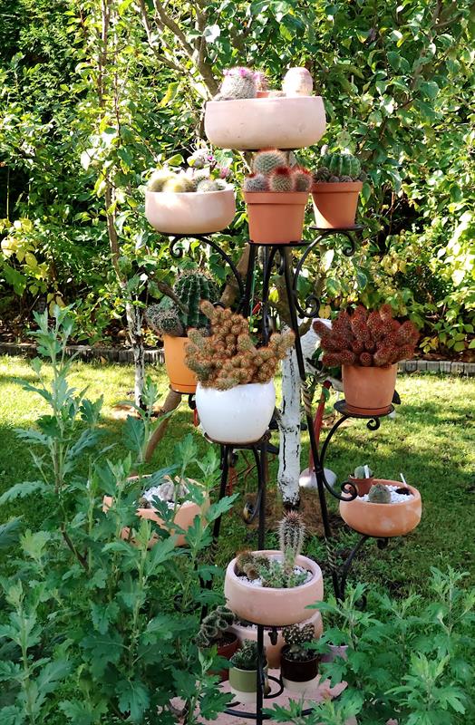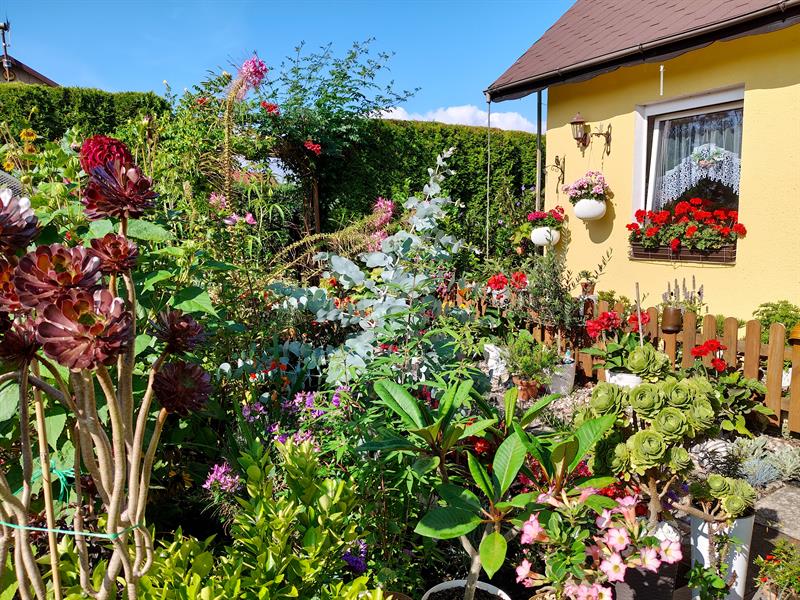 - Wilgotna ziemia sprawia, że przez cały sezon nie wymagają podlewania moje ulubione byliny: jeżówki, rudbekie, hibiskusy, gipsówki i słoneczniczki. Ale w donicach musimy hodować masę naszych egzotycznych roślin: odmiany eonium drzewiastego, róże pustyni, granatowiec, figę, mandarynkę, cytrynę, kaktusy, sukulenty - stwierdza p. Wioleta. - Nie tylko egzotyków mamy tu sporo... Eukaliptusy, plumerie, cleome, rącznik czerwonolisty, , strzałkowiec grzechotkowy, „lisie ogony" pokrywca, dalie. Każdy rarytas i ogrodnicza nowinka, obowiązkowo (!), muszą się znaleźć w naszym ogrodzie. Targi - od Barzkowic po „Pamiętajcie o ogrodach" - są wpisane na stałe w nasz kalendarz.