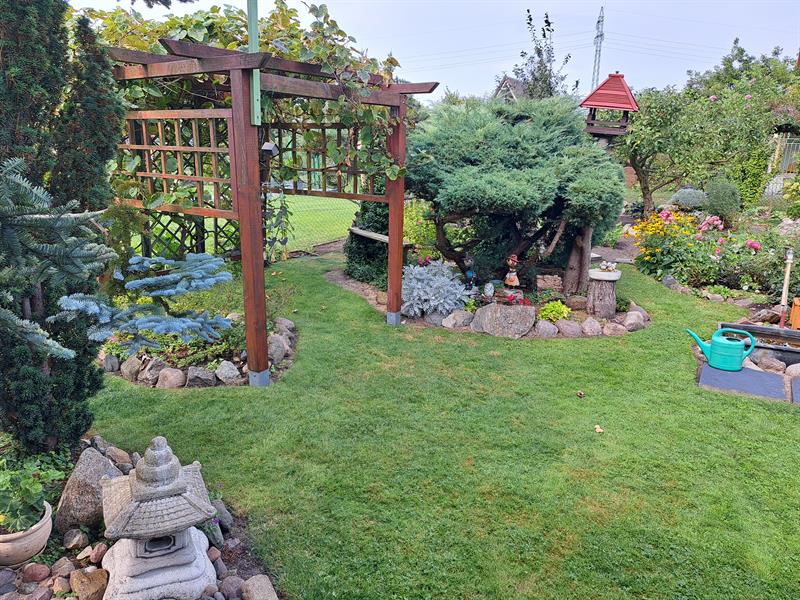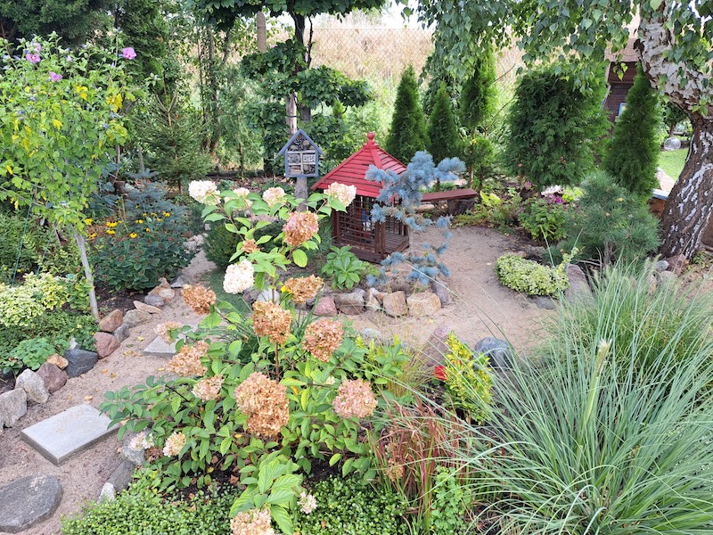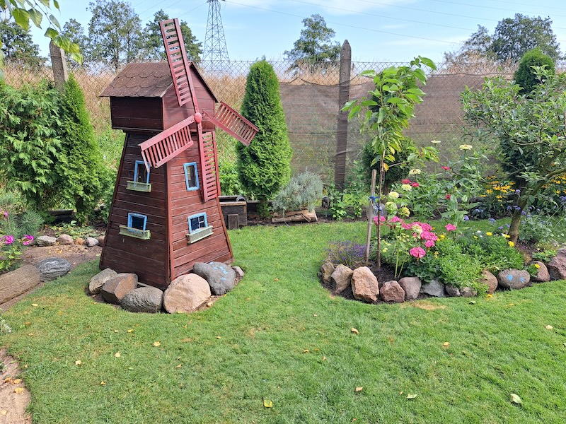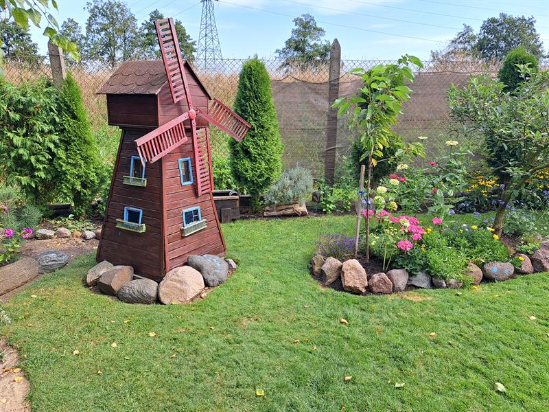W ogrodzie rosną także drzewa owocowe - jabłonie i śliwy. Oprócz tego państwo Drewsowie uprawiają maliny i borówki. Ogród podzielony jest na kilka części: wypoczynkową, oczko wodne, lasek z piaszczystymi ścieżkami i ogród warzywny. Na działce doliczyć się można aż czterech karmników. Wszystkie zbudował pan Marek. Dziełem męża pani Janiny jest większość technicznych konstrukcji w ogrodzie - w tym duży drewniany holenderski wiatrak.