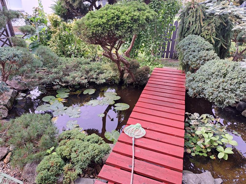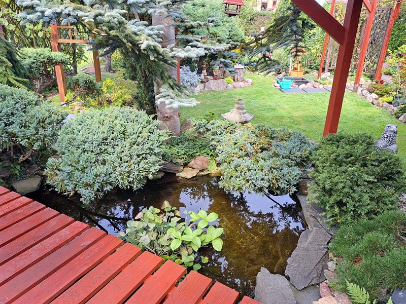 Jeśli chodzi o repertuar kwiatów, widzimy alstremerie, budleje, słoneczniki czy pelargonie. Zapytana o ulubione kwiaty, pani Janina bez wahania odpowiada, że są to czerwone róże. Oprócz kwiatów, na działce uwagę przykuwają także krzewy, między innymi dwudziestoletnie cisy - jak mówi pani Janina - przycinane w formie bonzai. Ciekawymi okazami są także rosnące tuż obok oczka wodnego hortensje pnące i azalie. Samo oczko jest duże. Robi wrażenie jednak nie tylko z powodu rozmiarów, ale też dzięki wyjątkowemu urokowi otaczających je przycinanych krzewów. Przez środek stawu biegnie drewniany mostek, po którym można przejść do furtki w ogrodzeniu. Chciałoby się powiedzieć - mostek japoński. Staw przywodzi na myśl ogród z obrazów Claude'a Moneta. Całość tchnie niezwykłym spokojem. Odczuwa się tutaj - tak jak z resztą w całym ogrodzie - wrażenie harmonii i równowagi. Do oczka wodnego przylatują nawet czaple. Siadają na kamieniach i niestety zjadają rybki. Woda jest filtrowana. Na pomysł budowy stawu pani Janina wpadła razem z mężem.