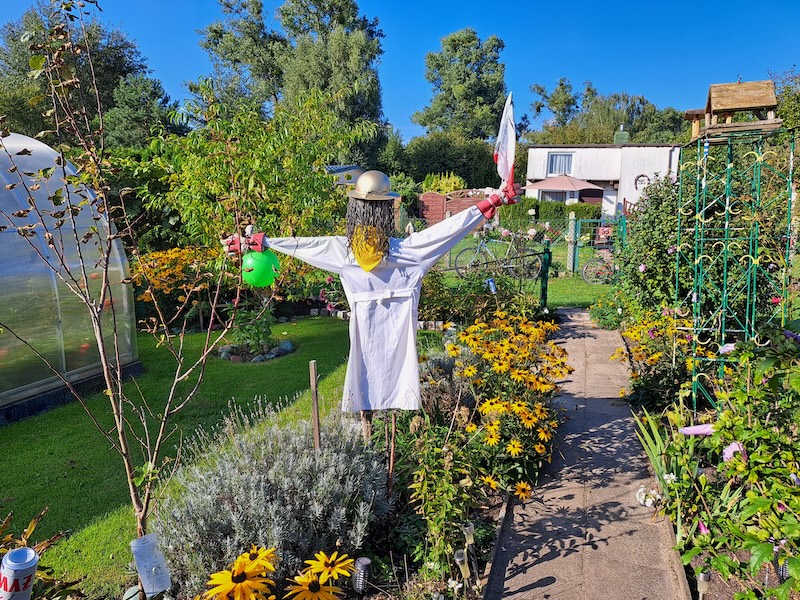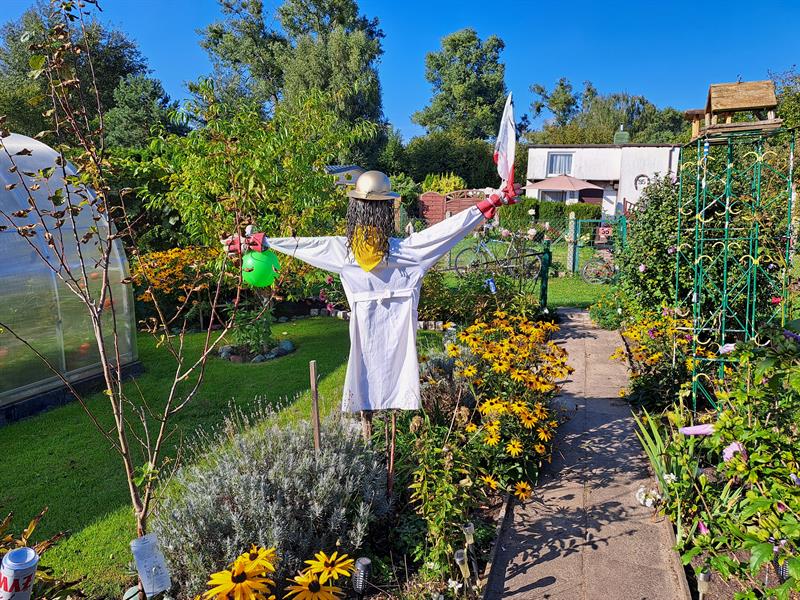 Chemiczne powiązania widać na działce gołym okiem. Przypomina o nich naturalnych rozmiarów strach na wróble odziany w laboratoryjny fartuch. Pani Monika przekonuje jednak, że ani myśli wykorzystywać swoją wiedzę w celach uprawy warzyw czy kwiatów. Zapewnia, że w ogrodzie stosują wyłącznie naturalne nawozy i sposoby uprawy przyjazne środowisku.