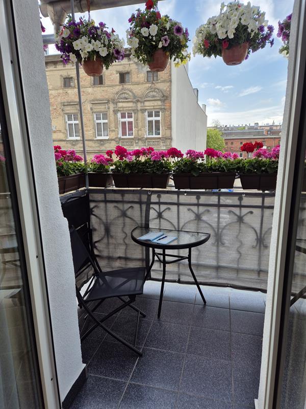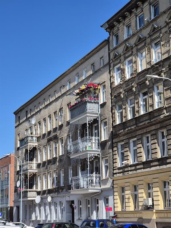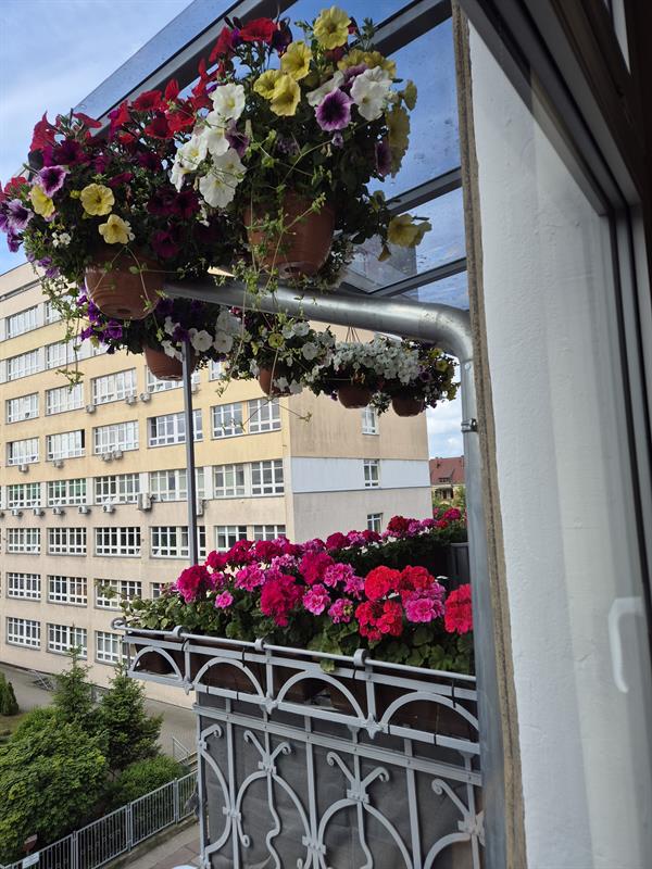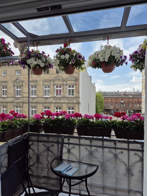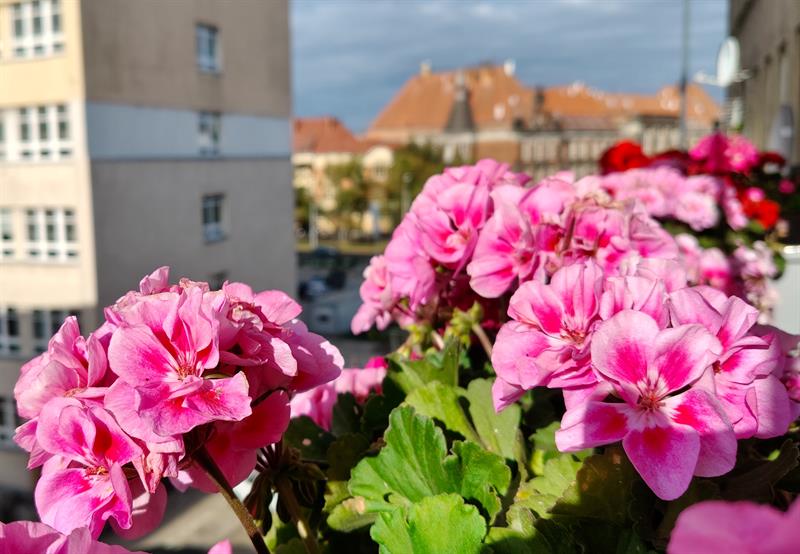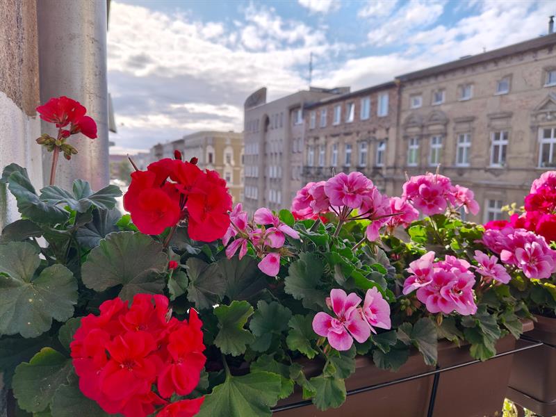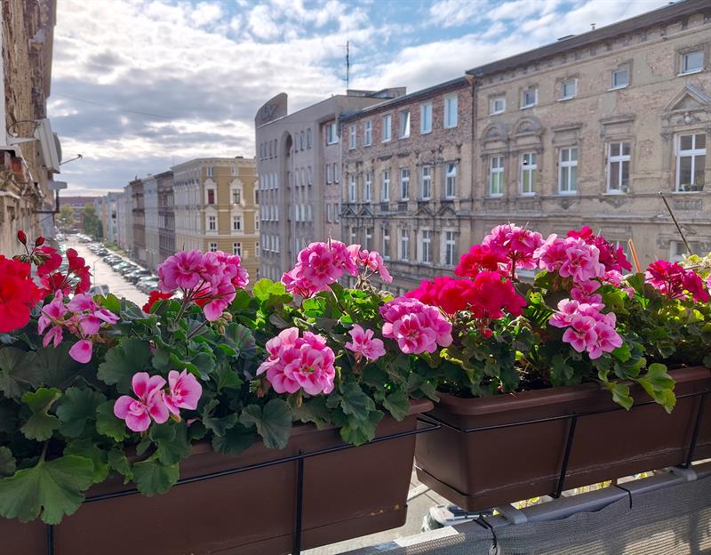 Jedna z dobrze zachowanych przedwojennych kamienic Śródmieścia. Z charakterystycznymi balkonami o bogato zdobionych balustradach z kutej stali. I tylko jeden z nich – na trzecim piętrze – tonie w kwiatach. Pelargonie, jak wcześniej surfinie, w energetycznych barwach przyciągają uwagę przechodniów ku wyjątkowemu „ogrodowi na wysokościach”.