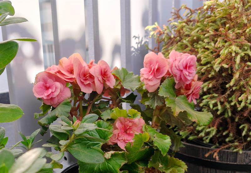 Oprócz pelargonii balkon zdobią także begonie, różanecznik, cyprysik i komarzyca. Są wieloletnie, więc i miejsce w rodzinnym „ogrodzie na wysokościach” zapewnione także w przyszłym sezonie.