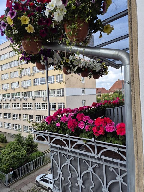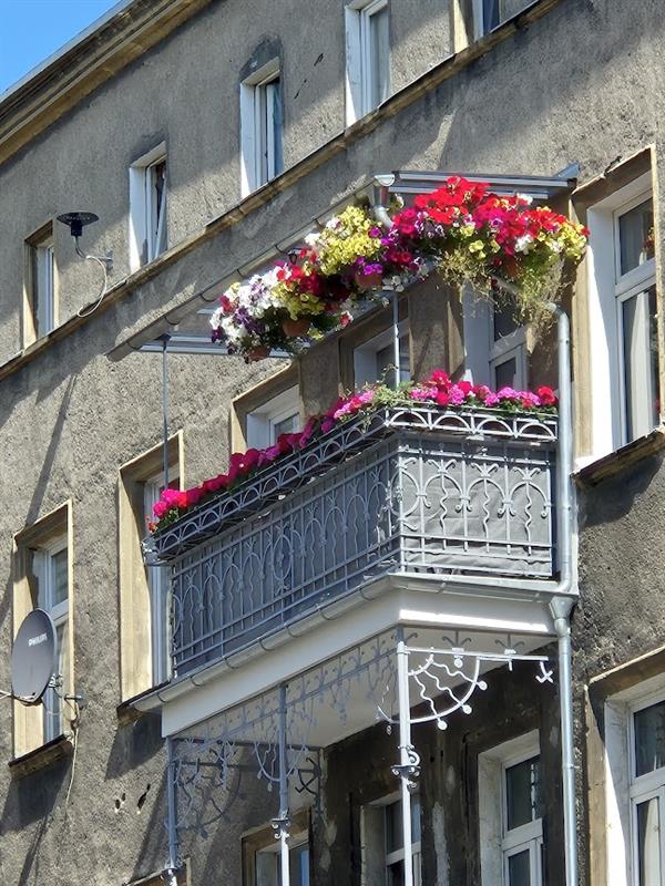 – Remont balkonów był gruntowny. Żeby przewrócić im dawny blask, każdy ze stalowych elementów balustrady był demontowany, a potem piaskowany, zabezpieczany przed korozją i malowany. Wymagające, ale też bardzo kosztowne były prace, przywracające historyczny wygląd ważnemu elementowi w wizerunku kamienicy – stwierdza p. Adam. – Ponieważ nasz balkon jest szczytowy, zostało nad nim zamontowane zadaszenie. Sprawdza się, bo chroni przed nadmiernym nasłonecznieniem oraz opadami. Jednak dla mnie był polem eksperymentu: podwiesiłem pod nim donice z surfiniami. Niestety, nie przetrwały zmiennej pogody tego lata. Gdy przestały zdobić, musiałem je usunąć na długo przed końcem sezonu.
