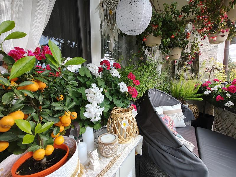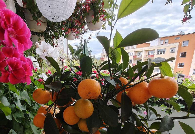 – Za gwiazdę w tegorocznej aranżacji roślin robi u mnie klementynka. Dzięki ubiegłorocznej nagrodzie w „Całym Szczecinie w kwiatach” mogłam sobie pozwolić na taką ogrodniczą ekstrawagancję – mówi p. Beata. – Aktualnie, cała jest obsypana niewielkimi pomarańczowymi owocami. Podobno można je jeść, ale to zdecydowanie nie mój smak: są zbyt kwaśne. Natomiast fantastycznie się sprawdzają jako dodatek do orzeźwiających lemoniad oraz herbat. Które dopełniam miętą, hodowaną w odmianach na balkonie, a przetykaną oregano i… szczypiorkiem.