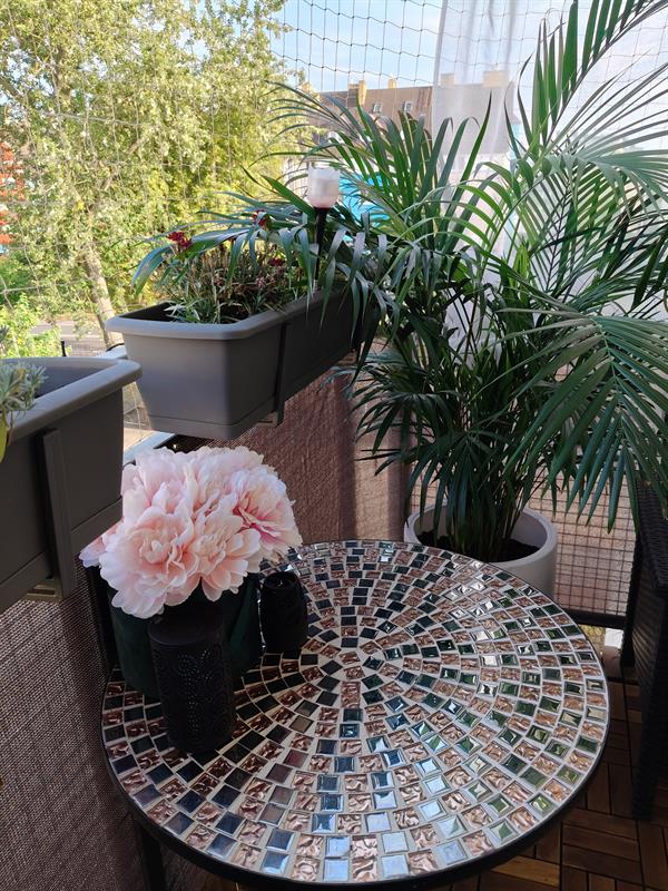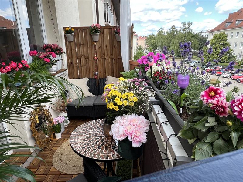 Są małżeństwem od roku. Piękni i młodzi. I wszystko dla nich wciąż jest tak świeże i pierwsze. Także urządzanie balkonu… w „mundurowym” bloku. Ona chciała mu nadać intymności, nieco oswoić i ocieplić. On – w najcięższych pracach – ten klimat z marzeń odtworzył. Osłonił balkon i wyłożył drewnem. Zbudował przepierzenie, na którym ona w końcu mogła zawiesić donice z kwiatami: begoniami, fuksjami, aksamitkami, bratkami i słonecznikiem. Na balkonie stanęły wygodne meble: fotel i sofa, a też oryginalnie inkrustowany okrągły stolik. A wokół pojawiły się kolejne donice z niecierpkami, pelargoniami, lawendą i purpurowymi goździkami. Nawet z palmą, paprocią i różanecznikiem. Jest też skrzynka poziomek. Mimo niewielkiej przestrzeni znalazło się też miejsce na mini ogródek ziołowy z miętą, bazylią, oregano i koperkiem. Nawet dla Jimka – bystrego i zwinnego bengalskiego kota, którego kuszą nie tylko liście, ale również sznury świateł.