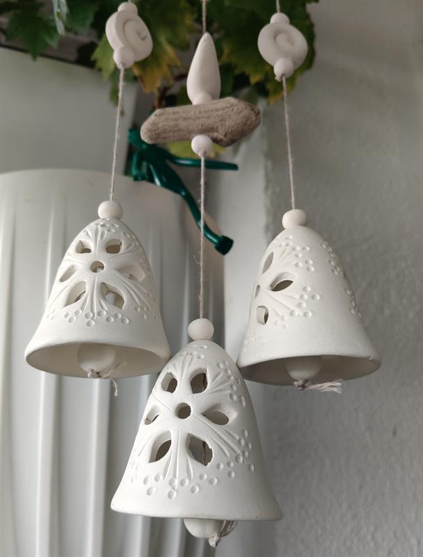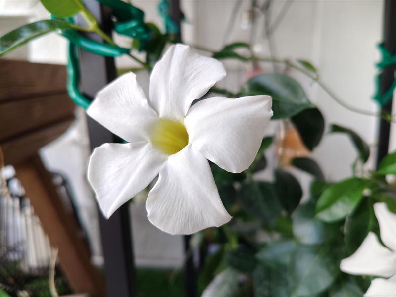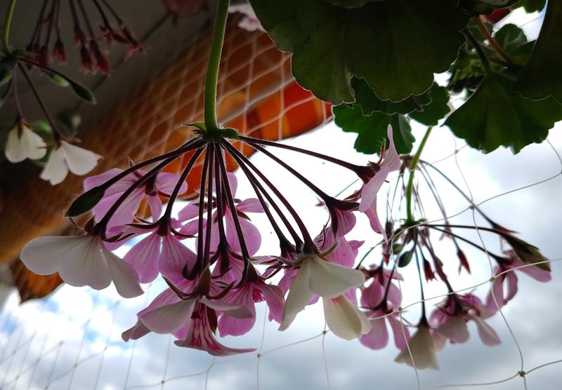 Przez cały sezon kwitną tu kaskadowe pelargonie: różowe i czerwone. Jedne dzielą miejsce na parapecie z papugami, gdy inne - w amplach - przyciągają uwagę ku ogrodowym „łapaczom wiatru" oraz kolekcji dzwonków - od metalicznych po gliniane. Natomiast na zewnętrznej balustradzie efektownie się prezentują kompozycje z białych surfinii i dwubarwnych komarzyc, przetykane soplami solarnych świateł. Opodal nich pną się białe sundaville, jaśmin wonny, a nawet - tegoroczny eksperyment - szczep białego wina. Wieczorami - podobnie jak oleandry - oświetlone lampionami.
