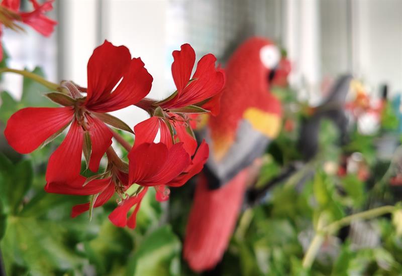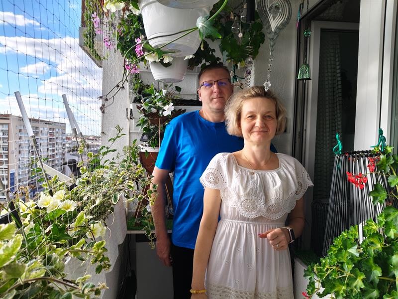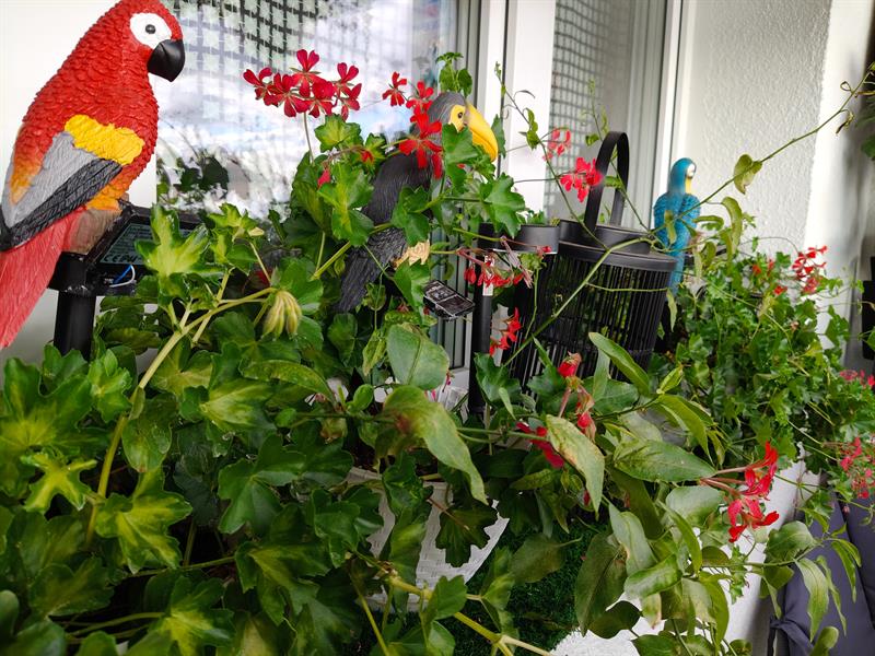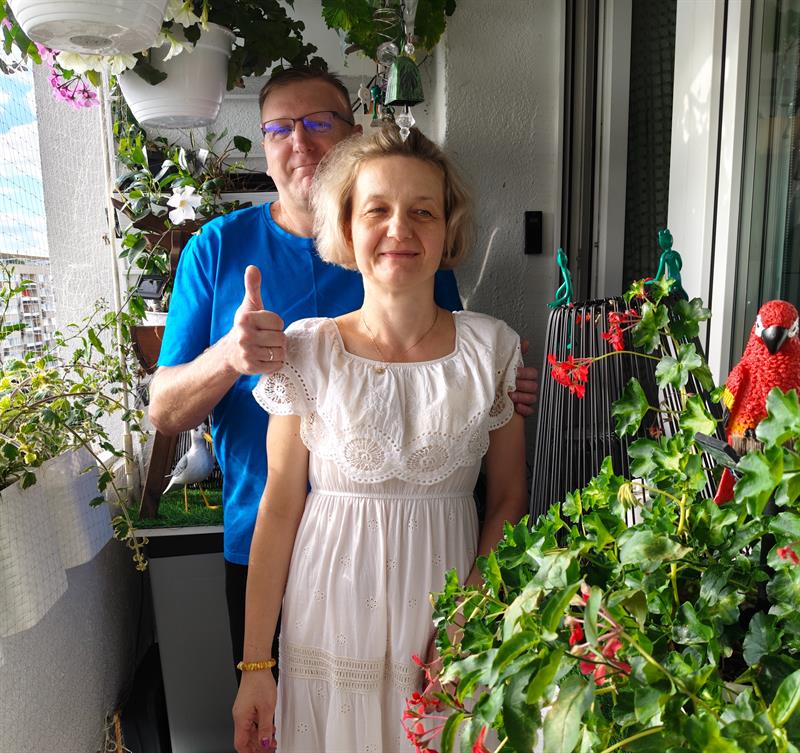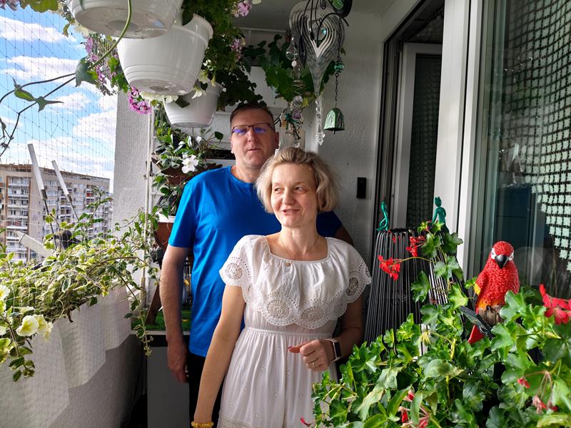 - W minionych latach eksperymentowaliśmy z różnymi kwiatami. Niestety, na tak nasłonecznionym balkonie nawet najpiękniejsze usychały. Teraz mamy te rośliny, które kochają słońce. Rosną pięknie, co nas bardzo cieszy, daje satysfakcję - przyznaje Anna Pruska, która wraz z mężem Jerzym wypełnia kolorami, roślinami i zwierzęcymi motywami ów „ogród na wysokościach".