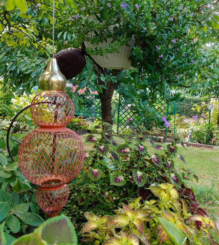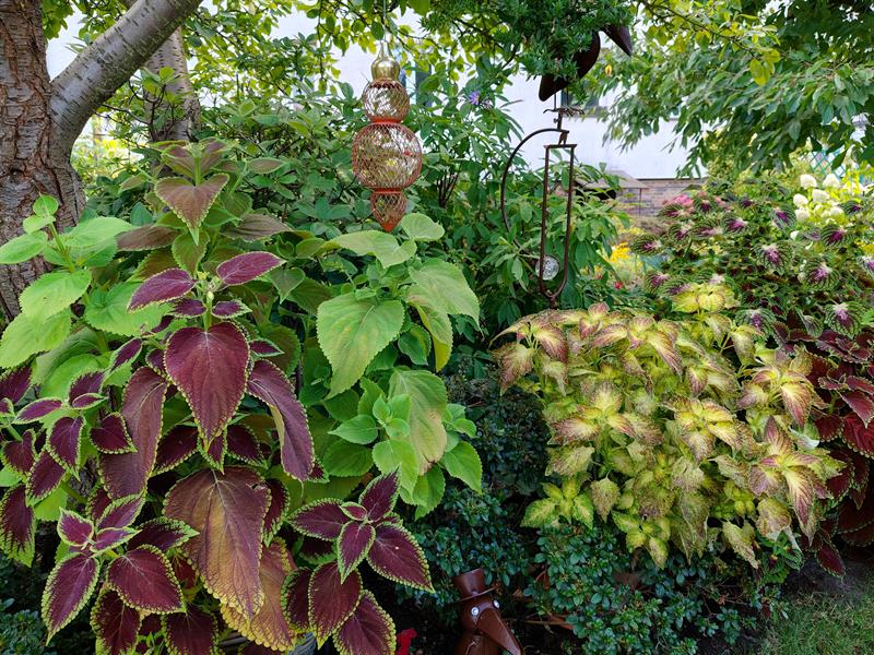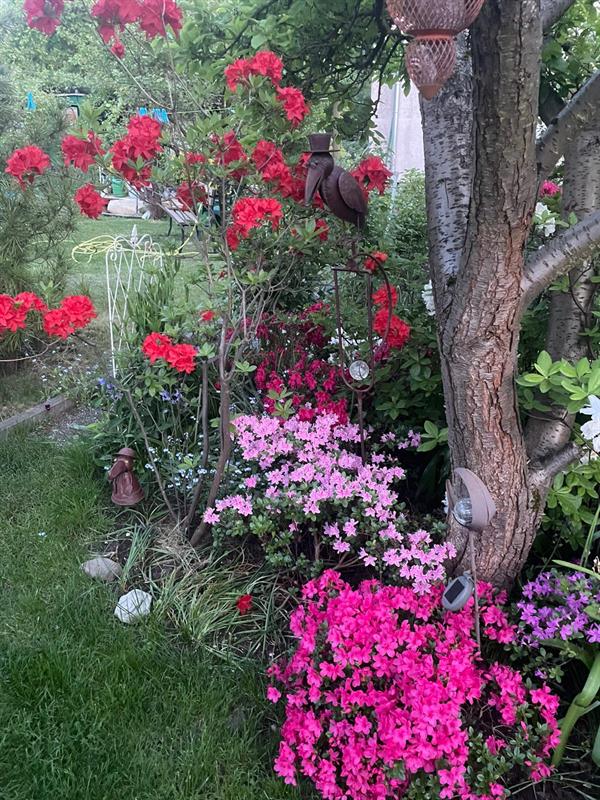 – Pierwsze pojawiają się krokusy, potem narcyzy i tulipany. Po nich rozkwitają azalie. Jako pierwsze żółte i pachnące, a następnie białe, różowe i niemal brązowe. Nieco później kwiatami się obsypują rododendrony: białoróżowy i czerwony. A po liliowcach, wszystko bucha. Wtedy na ogród wystawiam koleusy. Mamy ich mnóstwo, bardzo różnorodnych odmian. Zimą zastawiam ich sadzonkami wszystkie parapety. Już nimi „zaszczepiłam” jedną koleżankę, ale chciałabym nimi obdarować wszystkich chętnych. Tylko nie wiem, jak to zrobić. Rozsadzam więc te kruche, delikatne i wrażliwe, niezwykle efektowne rośliny… Gdzie tylko mogę. Bez preferencji, wszystko zależy od weny – opowiada p. Elżbieta.