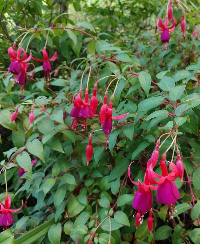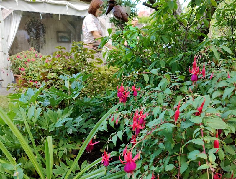 Tak też skomponowała ogród – kreatywnie. W oryginalny, kolorowy piękny dywan roślin ozdobnych z liści i barwnych kwiatów. Głównie wieloletnich, choć przetyka je sezonowymi dodatkami: bratkami, petuniami, surfiniami. Wśród tych pierwszych są np. blisko 15-letnie fuksje. Ale też jej ulubione piwonie drzewiaste.
