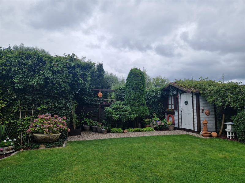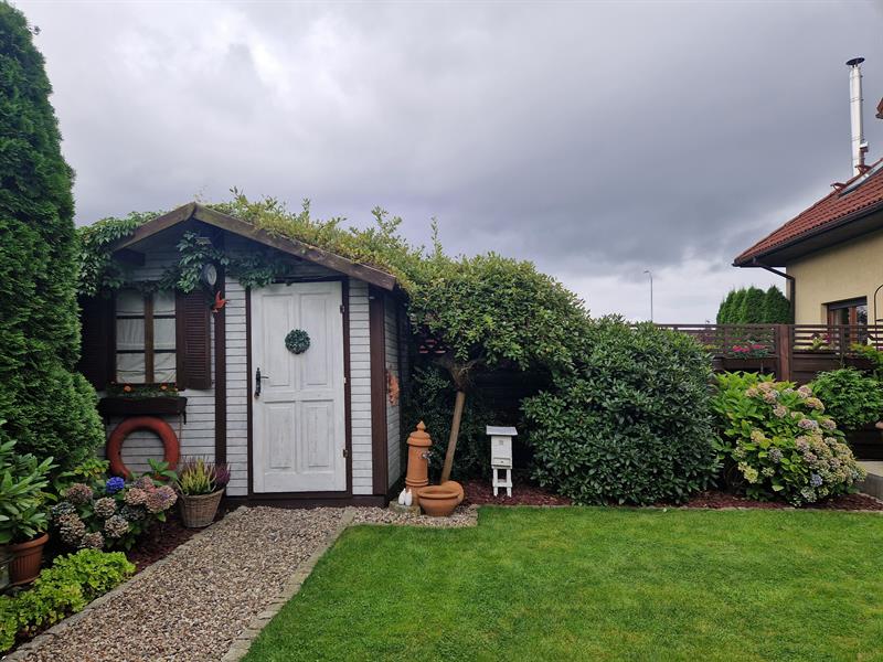 Ten domowy ogródek zachwyca przemyślaną aranżacją, trochę baśniową aurą – jest tam domek, który wygląda jak z bajki, choć to po prostu niewielki warsztat męża pani Agnieszki.