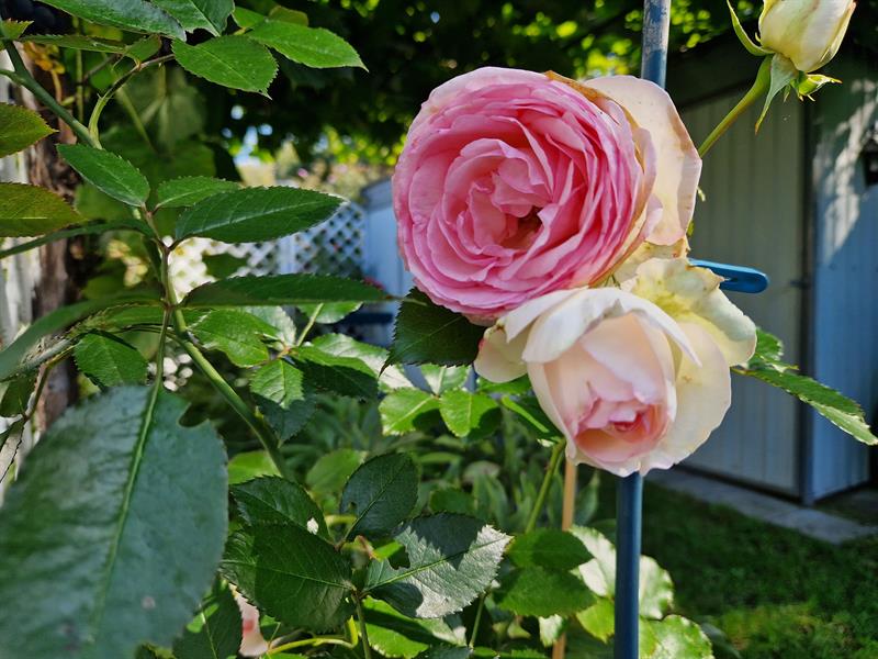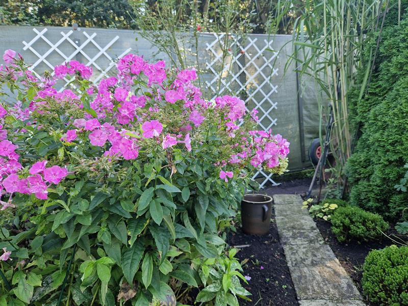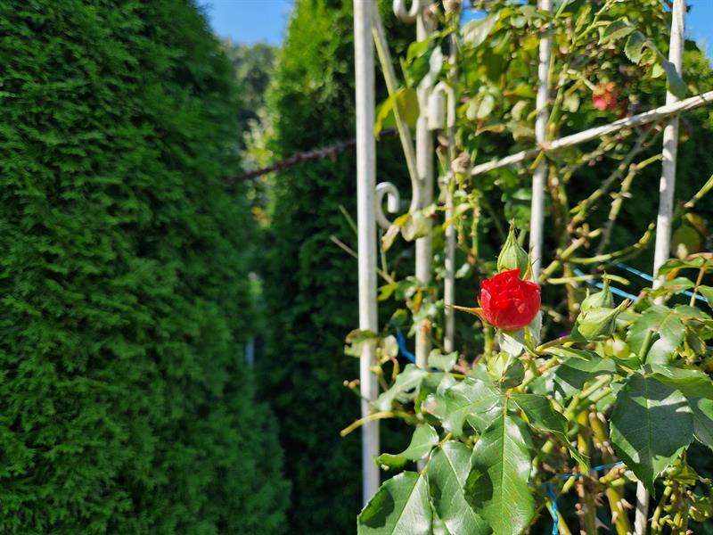 Centrum działki stanowi trawnik – oczywiście równo przystrzyżony, elegancki, przyozdobiony drobnymi kamieniami w jednolitym kolorze. Wokół gęste grządki z kwiatami i roślinami – o tej porze niewiele z nich już kwitnie, ale jeszcze gdzieniegdzie widać kolorowe róże czy inne kwiaty. Rosną też hortensje, a na specjalnych, zawieszonych na płocie białych półeczkach pojawiły się poziomki. W tym roku pani Barbara posadziła je po raz pierwszy.