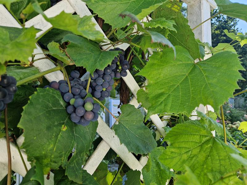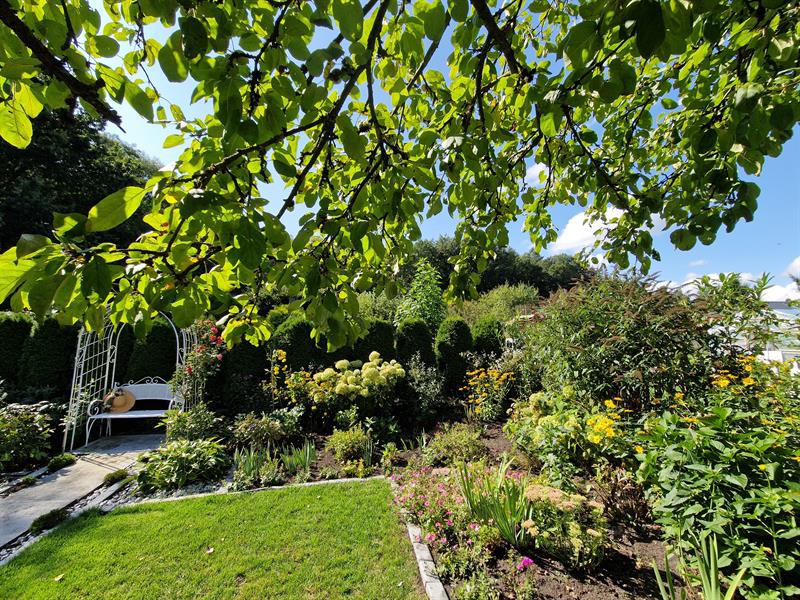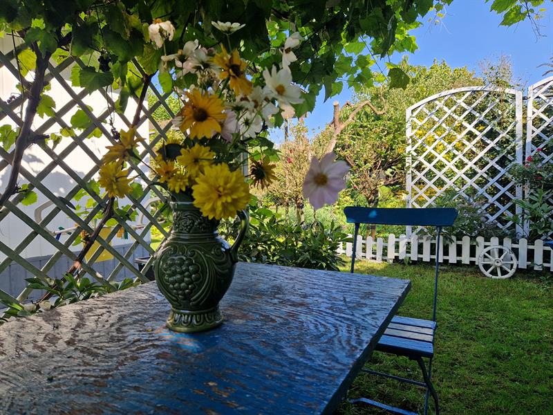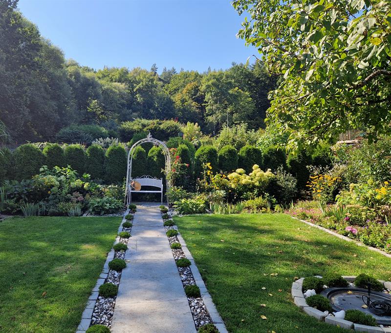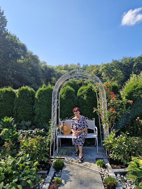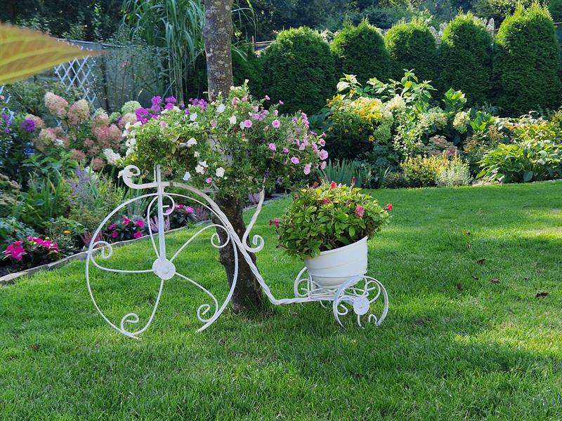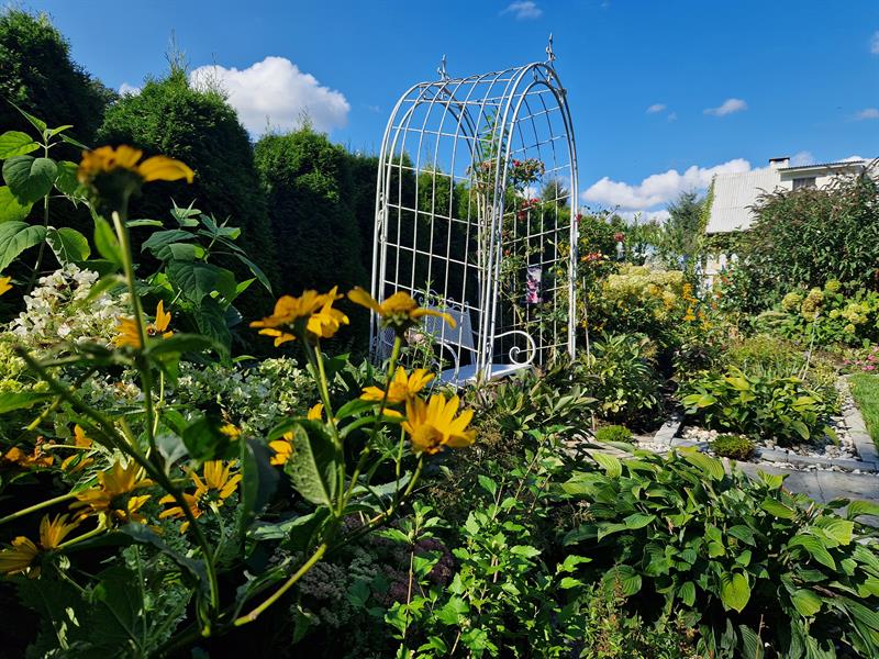 Rzeczywiście bliskość lasu sprawia, że miejsce jest fantastyczne. Ale ogródek pani Barbary zachwyca już od samego wejścia. Wszędzie kwiaty, ozdoby, piękna zieleń. Na prawo od wejścia stoi drewniana pergola z winoroślą, pod nią stoi pomalowany stolik a na nim – wazon z kwiatami. Miejsce trochę jak z baśni.