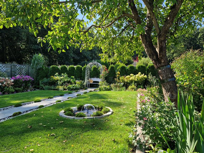 Jest też mała fontanna, domek z wyposażeniem, przyozdobiony obrazami namalowanymi przez panią Barbarę, na środku rośnie też jabłoń. Uwagę zwraca magnolia i niewielki, ozdobny rowerek z doniczkami postawiony obok niej. Kilka metrów dalej jest ławeczka a nad nią biały, metalowy ozdobny łuk – również baśniowy i romantyczny.