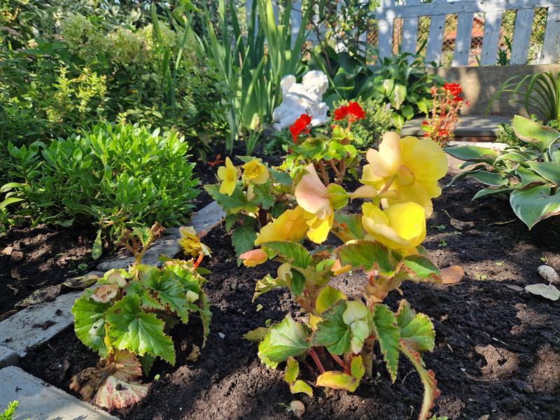 Kwietną działkę urozmaicają figurki kotów, ptaków, jest także aniołek. Pani Barbara lubi takie detale i dba o to, aby wszystko do siebie pasowało pod względem estetyki.