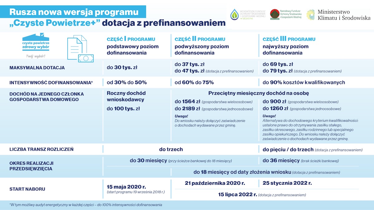 Od połowy lipca nowe osoby, korzystające z programu, mogą skorzystać z prefinansowania. Właściciele domów jednorodzinnych, ubiegający się o wsparcie na wymianę starego pieca (tzw. kopciucha) mogą dostać z wyprzedzeniem do 50% maksymalnej kwoty dotacji. Taka możliwość dotyczy wnioskodawców, którzy są uprawnieni do podwyższonego i najwyższego poziomu dofinansowania. W praktyce: mieszkańcy, którzy korzystają z tego rozwiązania mogą dostać o 10 tysięcy wyższą dotację, niż bez prefinansowania. Maksymalna bezzwrotna dotacja w poziomie podwyższonym zwiększa się z 37 do 47 tys. zł, a w części najwyższej - z 69 do 79 tys. zł.