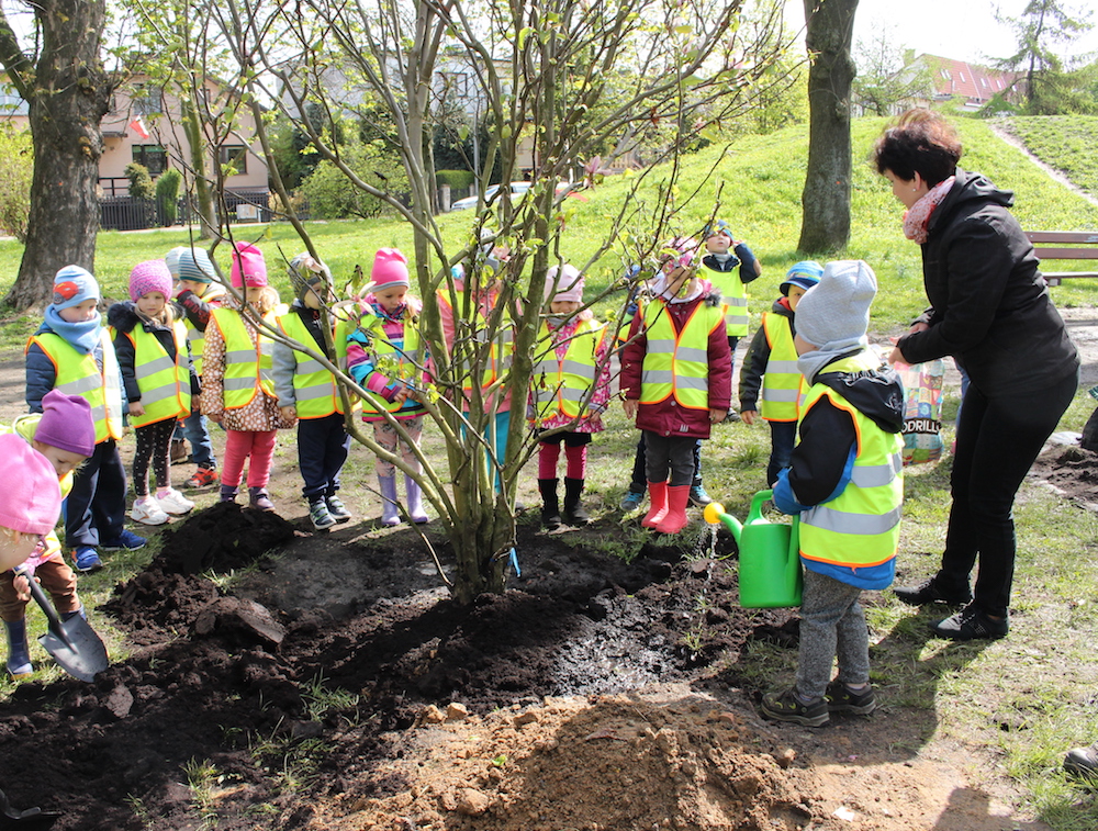 Na zdjęciu: przedszkolaki sadzą magnolie.