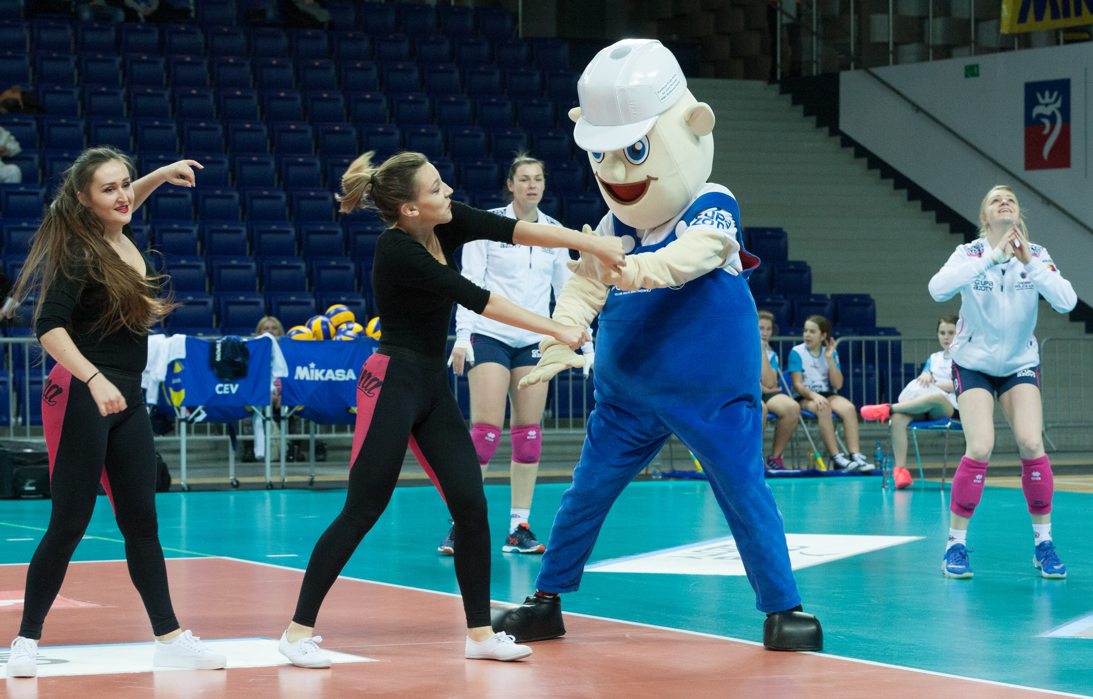 Na zdjęciu: Chemiczek przed każdym meczem przygotowuje się do występu razem z dziewczętami z zespołu tanecznego.