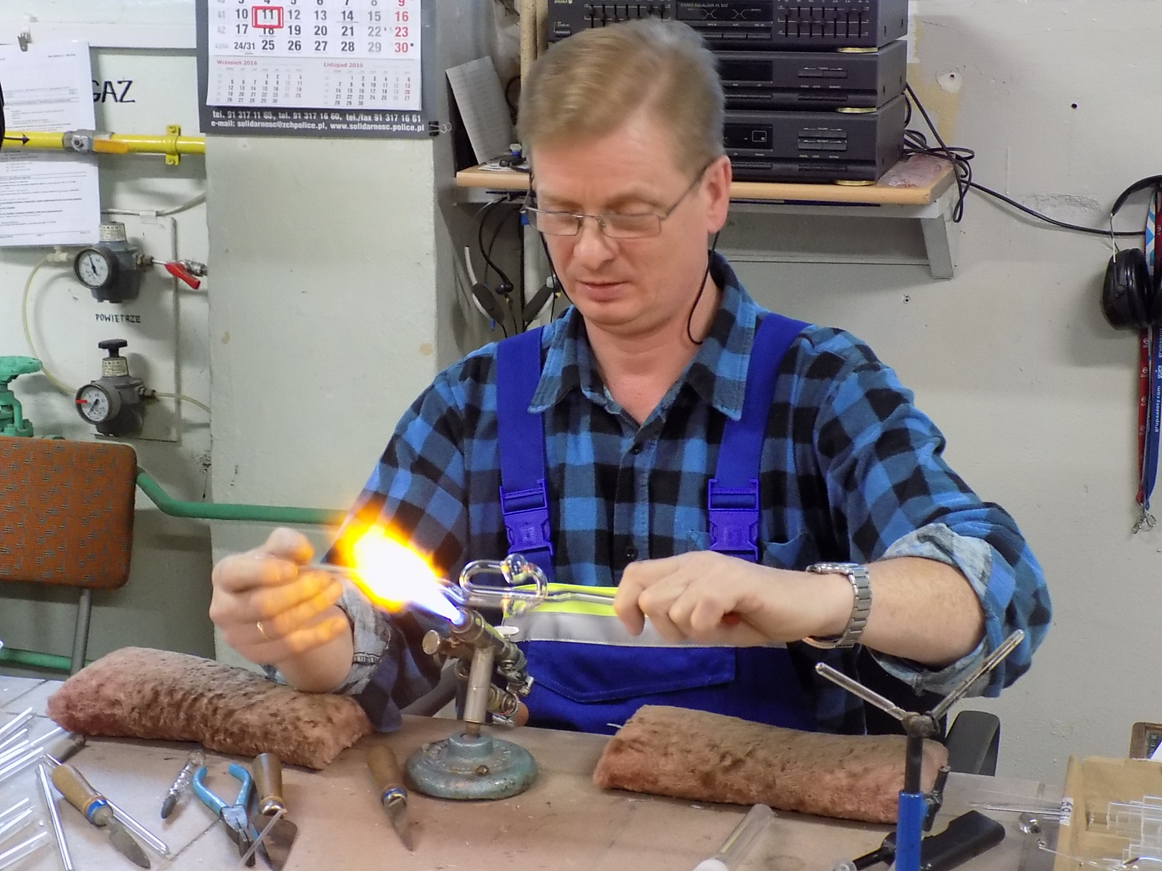 - Ja jestem z zawodu dmuchaczem szkła - opowiada Marek Sobczak. - Uczyłem się we Włocławku, w szkole przy Wytwórni Termometrów. Trzy lata poznawałem tajniki szkła termometrycznego. Potem koleje losu sprawiły, że wraz z rodziną trafiłem do Polic. Tu, dzięki panu Kicińskiemu z laboratorium zacząłem pracować jako dmuchacz szkła.