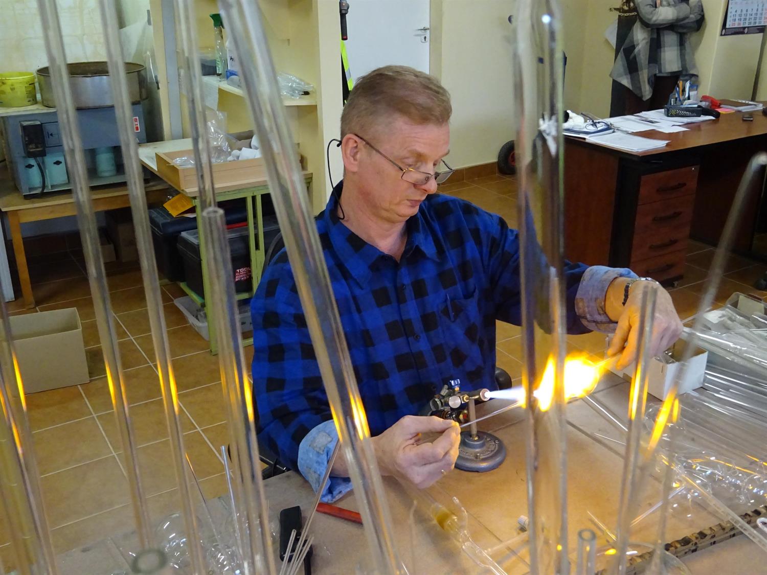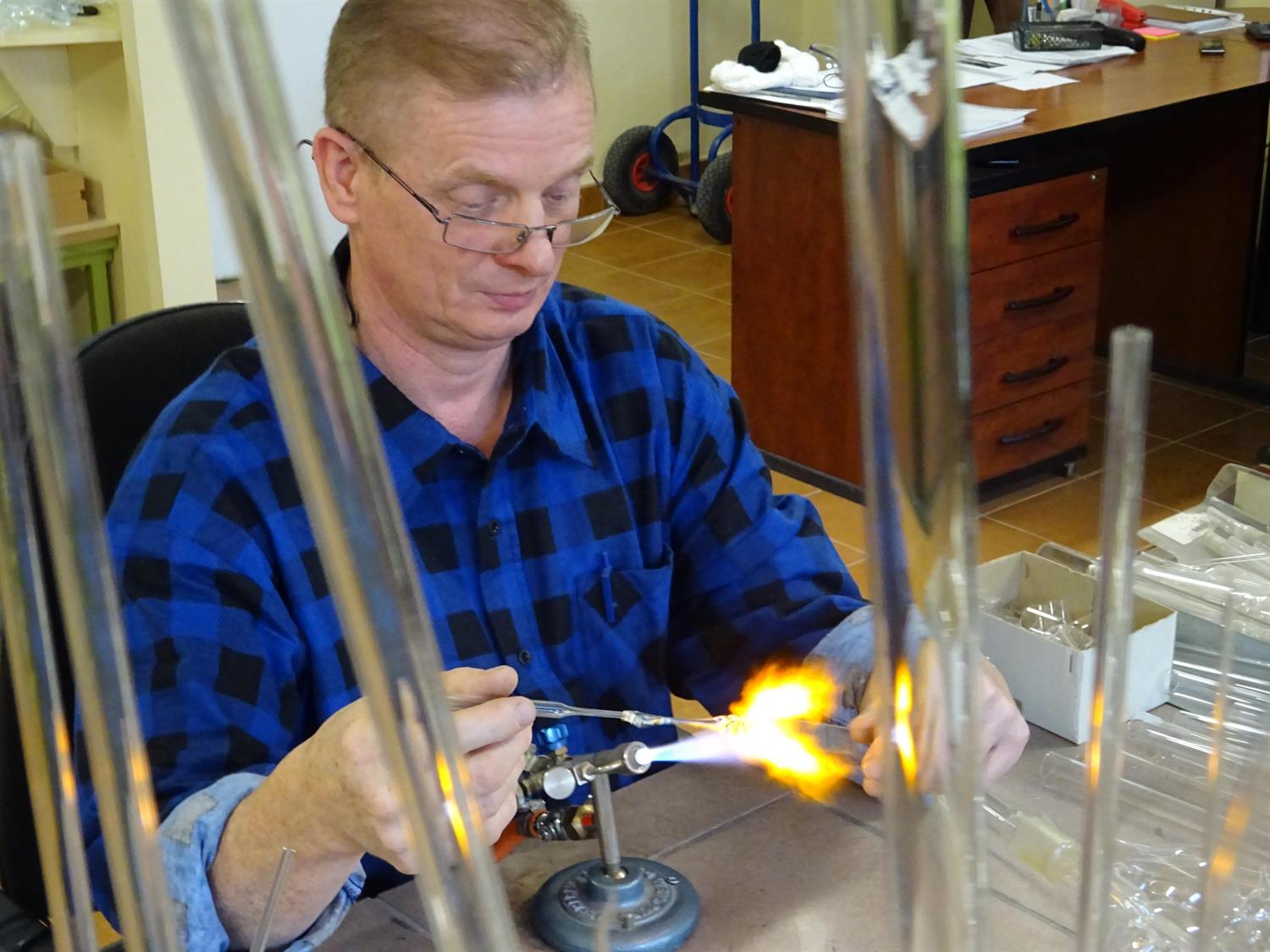 Choć naprawia szklane elementy skomplikowanych urządzeń, jego warsztat jest prosty. Podstawowymi elementami wyposażenia są: palnik, piec do rozprężania szkła, szlifierka.