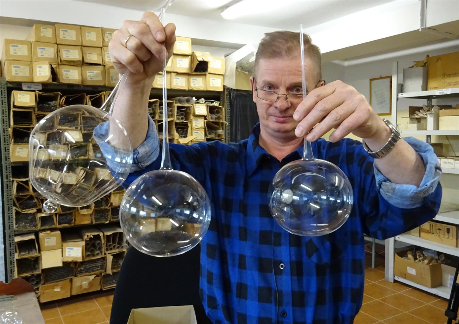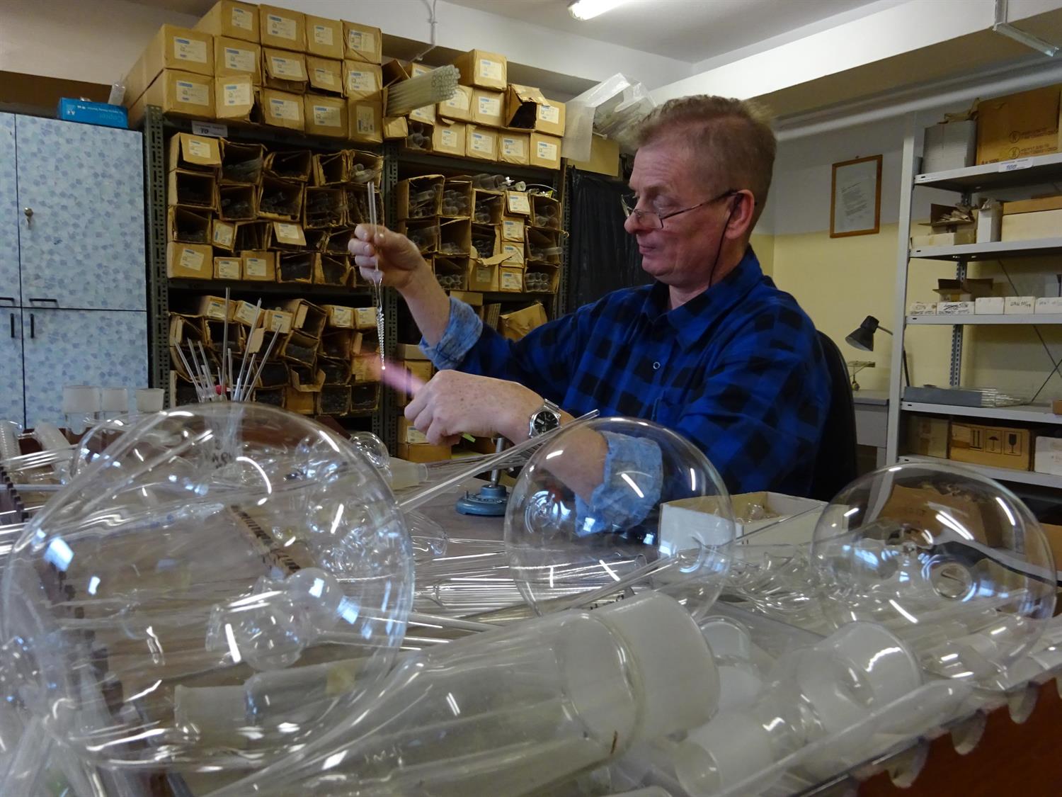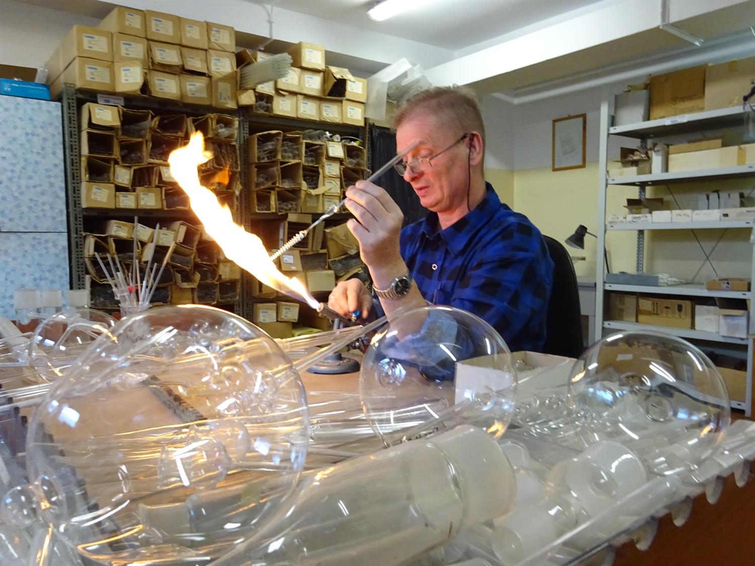 – Obecnie naprawiam szklany element aparatury elektronicznej, kosztujący na rynku 2,5 tysiąca złotych – wyjaśnia Marek Sobczak, dmuchacz szkła.