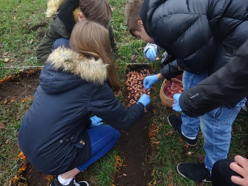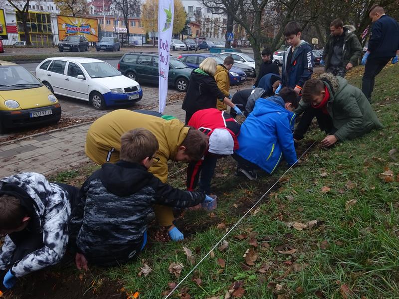 W posadzeniu prawie 10 tysięcy cebul pomagali uczniowie klas 7a i 7d Szkoły Podstawowej nr 7 w Szczecinie. W związku z tym, że była to ich pierwsza Krokusowa Rewolucja - choć szkoła bierze w niej udział od dawna - Sylwiusz Mołodecki przeprowadził krótką lekcję, jak należy prawidłowo sadzić krokusy.
