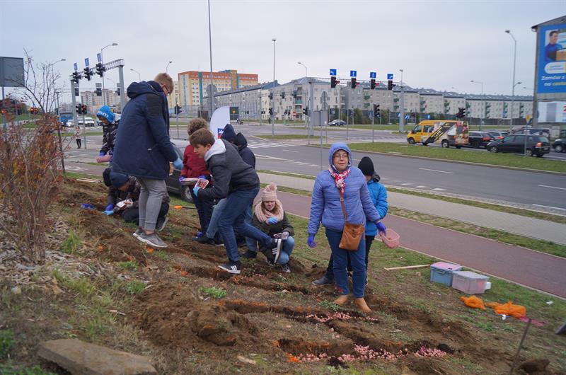 Napis ułożyli uczniowie z klasy VIIIb Szkoły Podstawowej nr 68. Na skarpie przy skrzyżowaniu ul. Wszystkich Świętych i Krasińskiego posadzili osiem tysięcy cebulek.