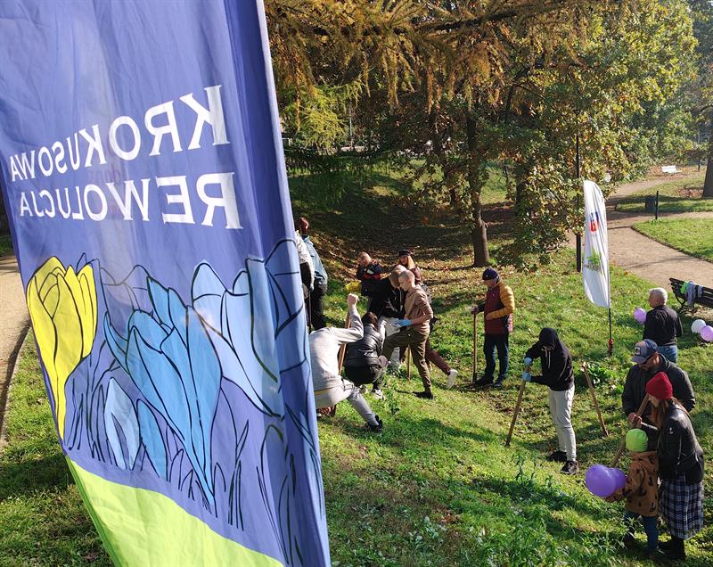 Gdy „krokusowa rewolucja" po raz pierwszy, przed laty, dotarła na pl. Jakuba Wujka, kwiatowe cebulki były sadzone przez wolontariuszy na trawnikach pomiędzy wjazdem od ul. Michała Bałuckiego po ul. Jerzego Bajana. Tym razem społecznicy zajęli przeciwległą skarpę - pomiędzy ulicami: Henryka Siemiradzkiego oraz Ludwika Solskiego. W szybkim tempie, w niespełna godzinę, posadzili 2,5 tysiąca krokusów, których sponsorem było stowarzyszenie OK Polska.