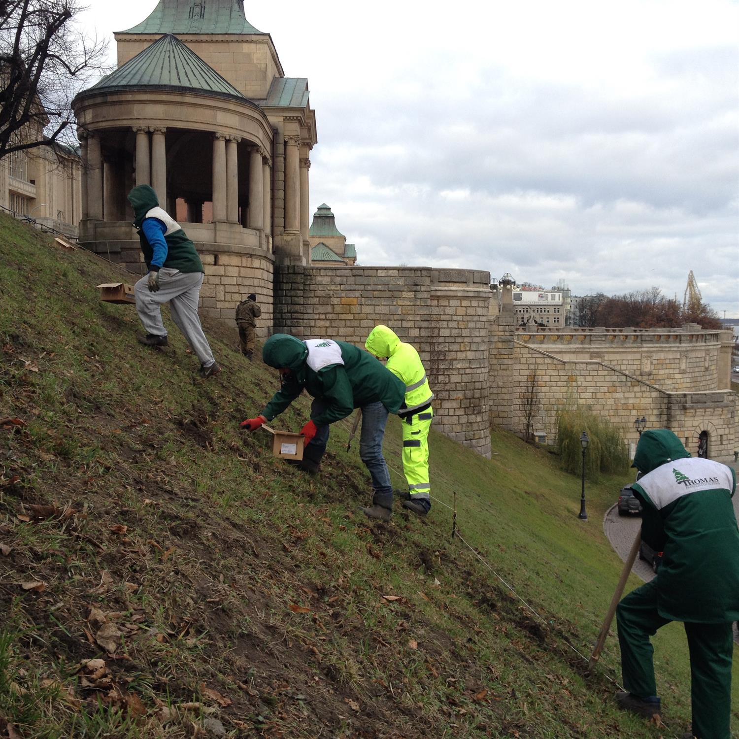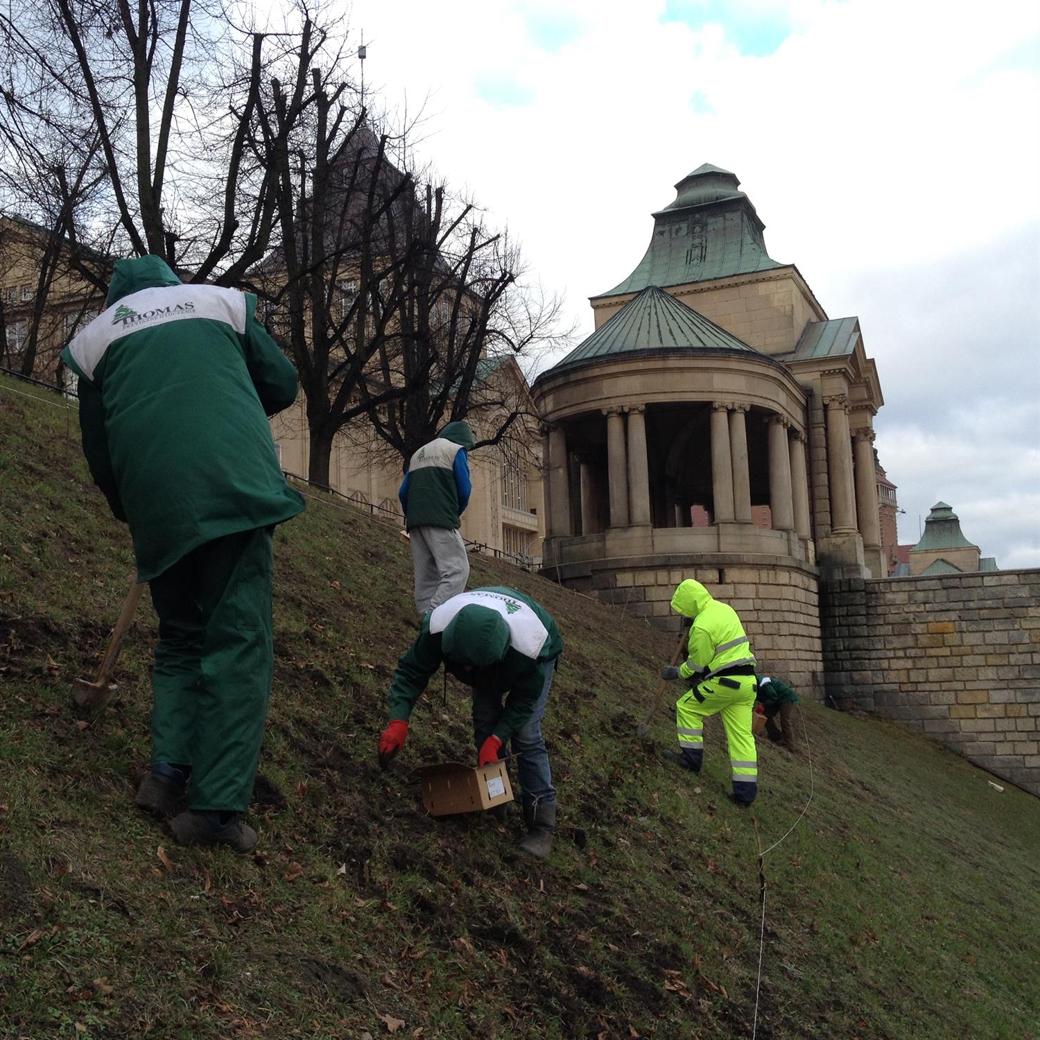 Kwiaty, czyli 150 tysięcy cebul odmiany Grand Maitre oraz 73 tysiące cebul King of Striped, sadzili pracownicy firmy Thomas. Układając z nich - wzdłuż skarp - dwa pięciometrowe pasy, które wiosną rozkwitnąć mają na ciemno- oraz jasnofioletowo (krokusy tzw. żyłkowane).