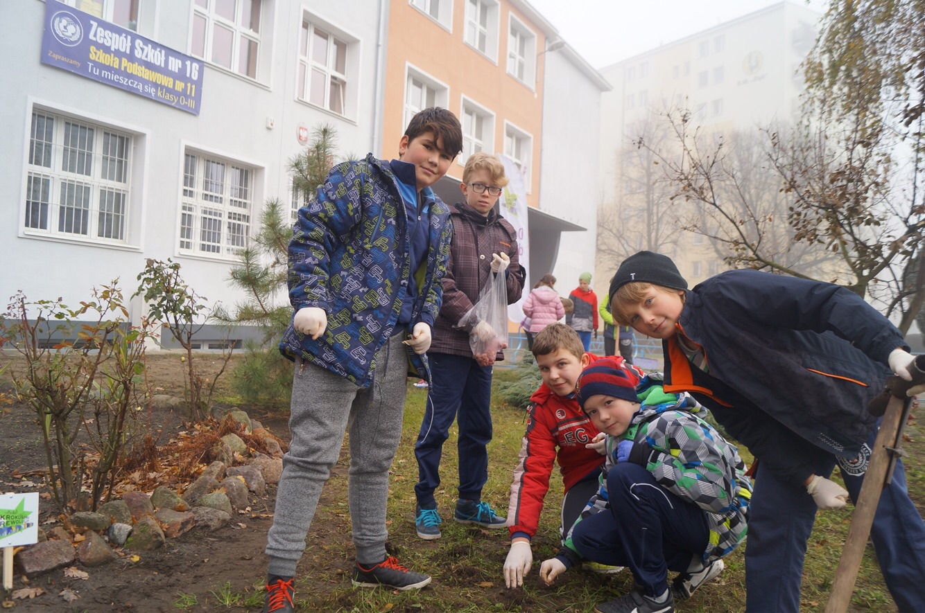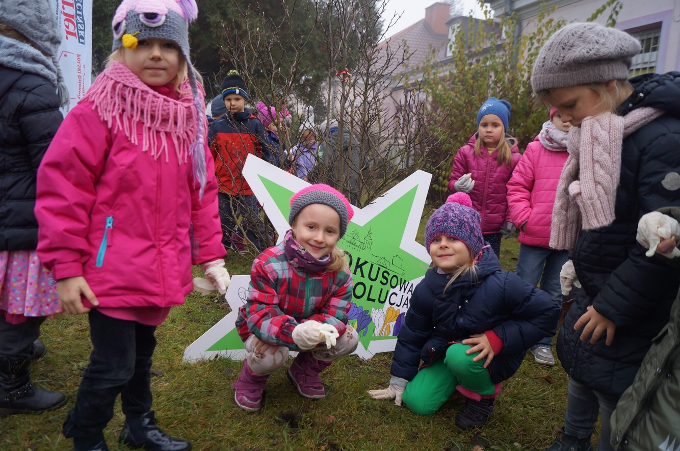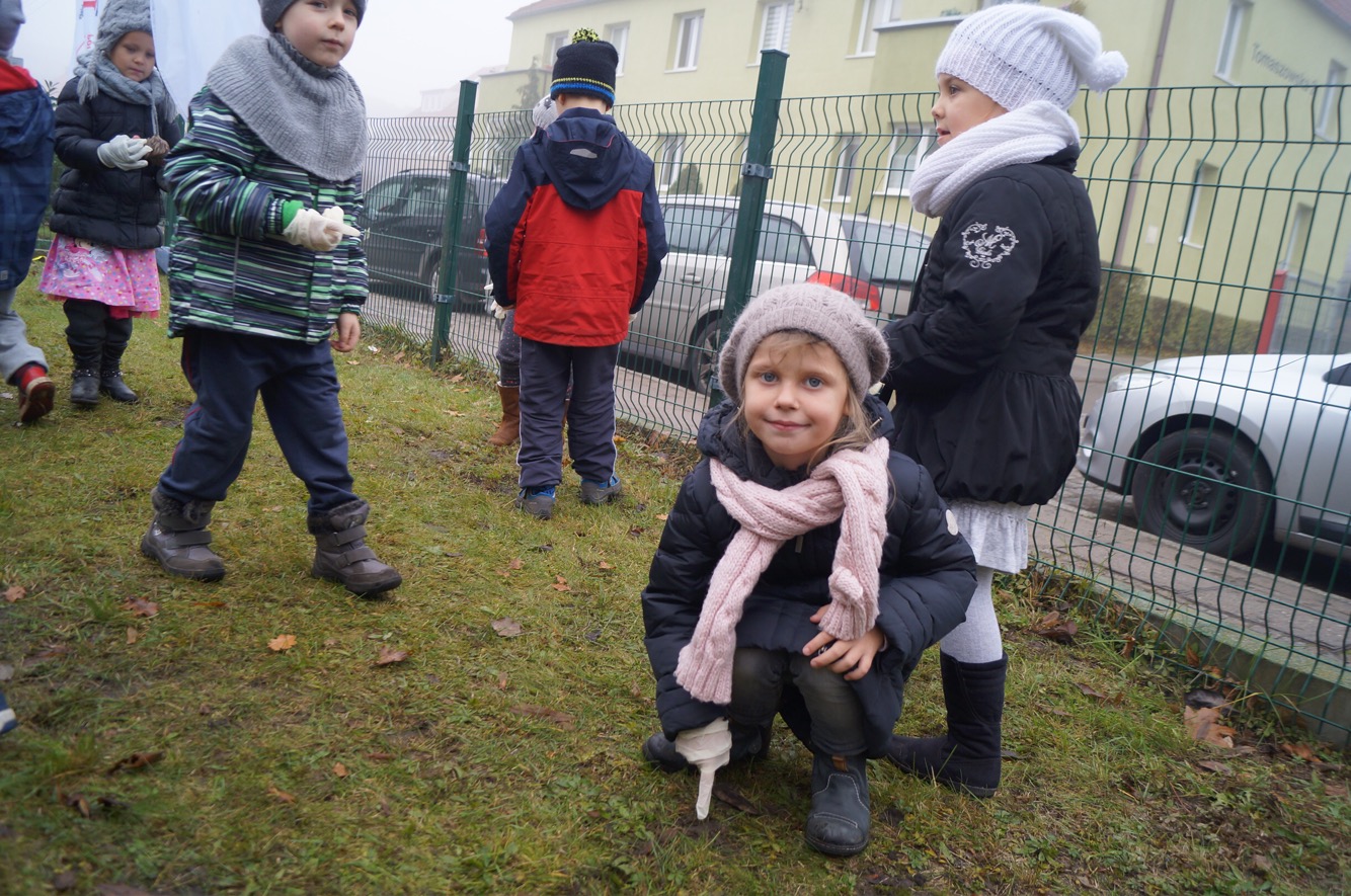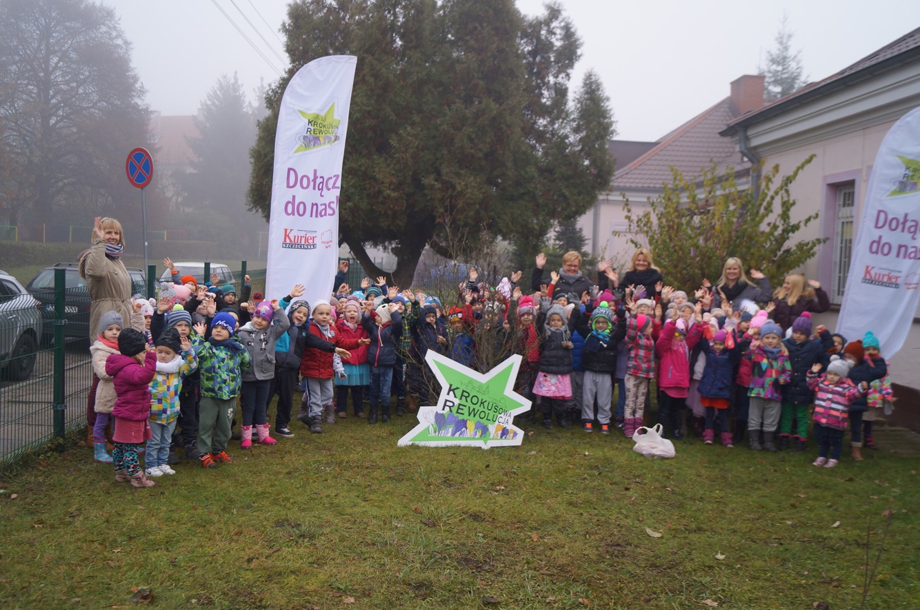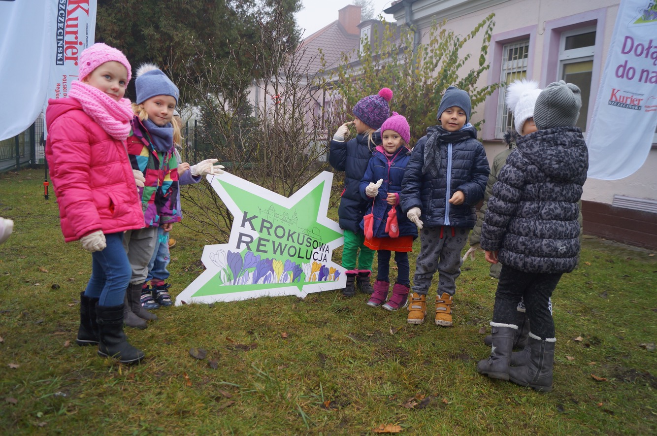 W środowy ranek (23 listopada) krokusowa rewolucja zawitała na ul. Dubois w Szczecinie przed budynek Zespołu Szkół nr 16. Ledwie godzinę później dołączyły do niej żabki, biedronki, promyczki i motylki z przedszkola nr 5 przy ul. Tomaszowskiej, nieopodal Stawu Brodowskiego, nad którym z Czytelnikami naszej gazety w październiku posadziliśmy kwiaty wiosny.