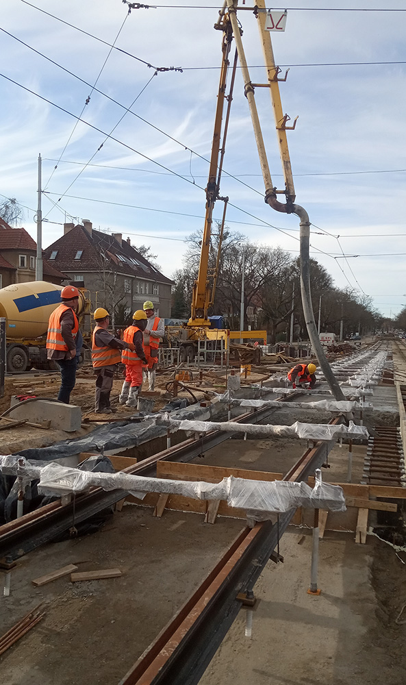 – Układamy szyny, następnie wylewamy warstwę betonu do stopki tej szyny, a potem kolejną górną warstwę betonu – tłumaczy inżynier Pietrzak. – Prace muszą zostać wykonane bardzo precyzyjnie. Trzeba zostawić równo 6 cm na warstwy asfaltowe.