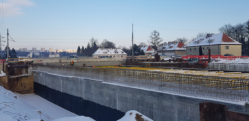 W okresie zimowym wykonawca inwestycji, której pełna nazwa brzmi „Budowa zintegrowanego węzła komunikacyjnego Łękno wraz z infrastrukturą na przebiegu Trasy Średnicowej dla obsługi wewnątrz aglomeracji ruchu pasażerskiego w Szczecinie”, skoncentrował się na budowie wiaduktu drogowego o roboczej nazwie WD-4. Jest to obiekt powstający w miejscu dawnego poniemieckiego wiaduktu usytuowanego nad torami w pobliżu skrzyżowania z ul. Traugutta. Brygady budowlane podwykonawcy – podszczecińskiej firmy Durobud z Mierzyna – realizowały roboty związane z budową podpór obiektu mostowego oraz przygotowaniem do betonowania ustroju nośnego. Już wiadomo, że ta druga czynność zostanie przesunięta z uwagi na panujące mrozy. Niska temperatura uniemożliwia bowiem lanie betonu.