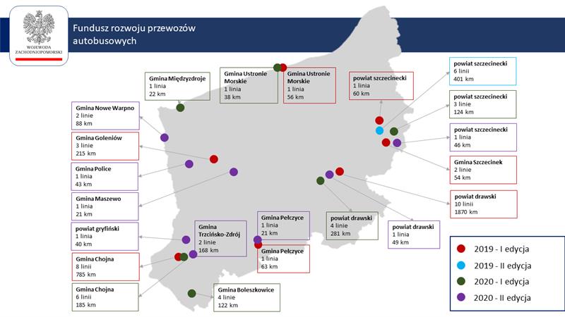 Dofinansowane zostaną linie w następujących powiatach: szczecineckim (dopłata – 58 788 zł, liczba linii komunikacyjnych – 1, łączna długość – 46 km; drawskim (w kolejności – 57 681 zł – 1 – 49,3 km); gryfińskim (10 480,8 zł – 1 – 39,7). Dotacje otrzymają też gminy: Maszewo (10 627,2 – 1 – 21,6); Nowe Warpno (93 808 zł – 2 – 88); Police (519 984 – 1 – 42,8); Pełczyce (15 687 – 1 – 21), Trzcińsko-Zdrój (150 750 – 2 – 168).