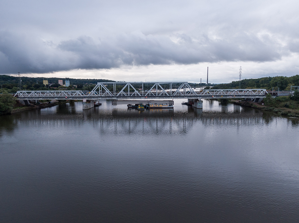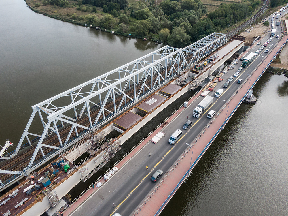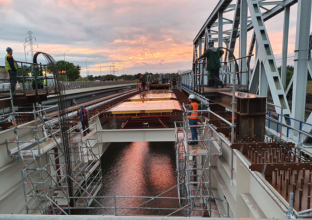 Stalowa konstrukcja mostu przez Regalicę w ciągu ul. Krygiera jest już na swoim miejscu. Pomimo utrudnień spowodowanych wiatrem wykonawca prac – konsorcjum firm Roverpol sp. z o.o. i Rover Infraestructuras S.A. – zakończył podnoszenie siłownikami hydraulicznymi z pontonów wszystkich sekcji mostu, po czym scalił te elementy. Umożliwiło to przystąpienie do prac związanych z wykonaniem żelbetowej płyty pomostu, po której będzie odbywał się ruch. Znaczne siły zaangażowane są obecnie w montaż szalunków i przygotowania do układania zbrojenia, gdyż zakres tych prac jest ogromny. Właściwego ułożenia wymaga blisko 400 t stali zbrojeniowej, a przygotowywane szalunki zostaną docelowo wypełnione betonem w ilości około 1 150 m szesc. Taka objętość odpowiada blisko stu trzydziestu betonowozom.