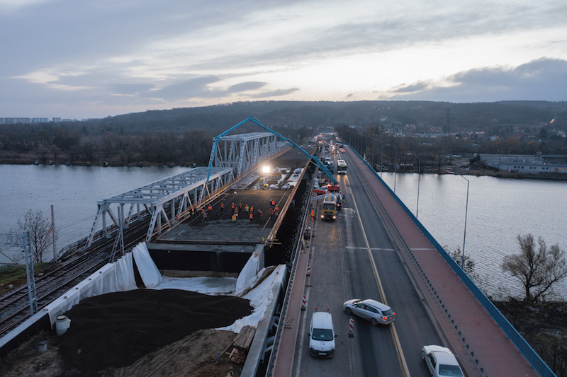 Beton w łącznej ilości 1150 m3 szczelnie wypełnił zamontowane wcześniej na konstrukcji stalowej deskowania z ułożonymi w nich setkami ton prętów zbrojeniowych. Przeprowadzenie tego niezmiernie trudnego w przygotowaniu i organizacji etapu prac pozwoli to wykonawcy na zminimalizowanie utrudnień w ruchu kołowym na ulicy Krygiera. W najbliższym czasie na płycie mostu ustawiony zostanie krawężnik oraz ułożone zbrojenie kap chodnikowych. Intensywne prace trwają już na dojazdach do obiektu, gdzie wykonywane są konstrukcje związane ze wzmocnieniem podłoża. Na przeszkodzie wykonawcy stoją przede wszystkim warunki pogodowe, które obecnie szczególnie mocno komplikują organizację prac. Wykonawca, podobnie jak uczestnicy ruchu korzystający z ul. Krygiera, liczy na wystąpienie sprzyjających warunków atmosferycznych w celu umożliwienia jak najszybszego zakończenia prac oraz przekazania obiektu do użytkowania.