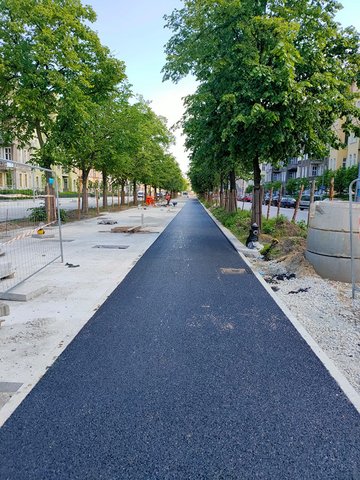 Przebudowa al. Jana Pawła II w Szczecinie mija półmetek. W lipcu pojedziemy fragmentem nowej ulicy. Na ścieżce rowerowej położono już równy asfalt.