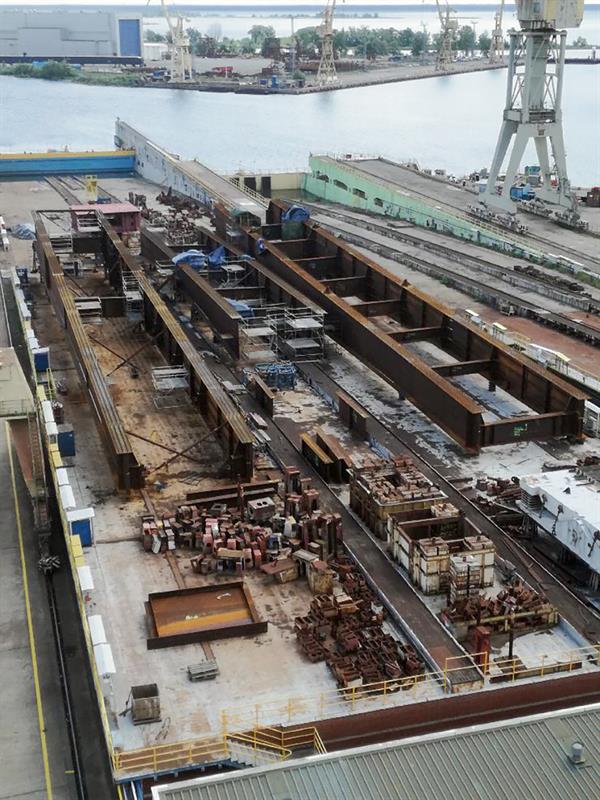 Obecnie na terenie stoczni prowadzone są roboty związane ze scalaniem poszczególnych sekcji konstrukcji stalowej w bloki montażowe. Pierwszy i drugi blok montażowy są już w pełni scalone. Prace przy ostatnim, trzecim bloku montażowym zostaną ukończone do końca lipca.