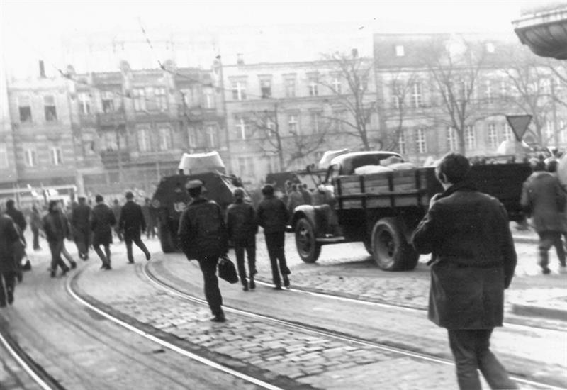 Podobnie jak w Trójmieście, w Szczecinie wprowadzono godzinę milicyjną od 18 do 6. Następnego dnia ludzie zbierali się od rana na pl. Żołnierza Polskiego w Szczecinie. Tłum zaatakował tam wozy pancerne kamieniami i butelkami z benzyną. Odpowiedziano ogniem. Do starć z wojskiem doszło też pod stocznią w godzinach rannych, gdzie zginęły dwie osoby: 16‑letni Stefan Stawicki oraz 22‑letni Eugeniusz Błażewicz. W kilku innych punktach miasta, gdzie robotnicy próbowali formować pochody i atakowali budynki instytucji państwowych kojarzonych z władzą, też użyto broni palnej. Tego dnia zatrzymano ogółem ponad 200 osób, w większości ludzi młodych lub bardzo młodych. W następnych dniach nadal dochodziło w mieście do potyczek z użyciem broni przez wojsko i milicję. W dniach 17–19 grudnia 1970 r. w Szczecinie zginęło 16 osób, w większości bardzo młodych. Rewolta grudniowa wchodziła w nowy rodział przekształcając się w całomiejski strajk okupacyjny, który objął ponad 100 zakładów pracy. Stworzono tzw. Ogólnomiejski Komitet Strajkowy, który przejął władzę w mieście. Powstała na kilka dni „republika szczecińska”.