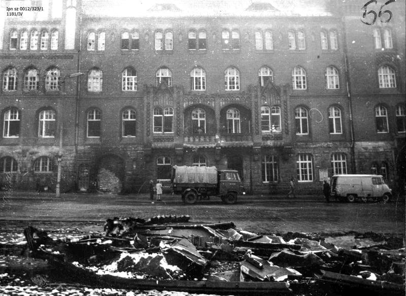 Paziewski pisał: „Po nieudanym ataku na bramę główną zasadnicze uderzenie przeniosło się na znajdującą się na lewo od niej mniejszą drewnianą bramę. Kiedy po jej zniszczeniu okazało się, że wejście jest zamurowane, kilofami oraz metalową ławką uliczną wykuto w niej duży wyłom. Wtedy do wdzierających się oddano wprost krótką serię strzałów z ręcznego karabinu maszynowego ustawionego za kołami ciężarówki, po czym broń się zacięła. Kule powstrzymały napór, choć prawdopodobnie wtedy zginęła jedna lub dwie osoby, a kilka innych zostało rannych. Znajdujący się wewnątrz budynku milicjanci kilkakrotnie strzelali seriami (również w metalową bramę od strony ulicy Starzyńskiego, forsowaną przez demonstrantów), tym razem tylko na postrach. Płonące mury, oblewane benzyną zabieraną z aut zaparkowanych w pobliżu, sprawiały wrażenie, że cała budowla stoi w ogniu. Wewnątrz komendy panował chaos i – spotęgowana ciemnościami (na skutek awarii instalacji elektrycznej) oraz groźbą wybuchu gazu – atmosfera strachu. Grozy dopełniał widok z okien – łuny ognia i chmury dymu wydobywające się z płonącego KW partii – oraz świadomość, że dwa dni wcześniej w Gdańsku spalono partyjne i milicyjne gmachy”.