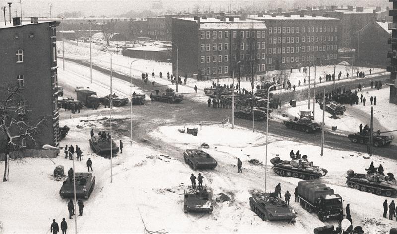 Wprowadzenie stanu wojennego 13 grudnia 1981 r. Głównym punktem oporu przeciwko władzy miała być Stocznia Szczecińska im. Adolfa Warskiego. W nocy 13 grudnia 1981 r. na terenie stoczni znaleźli się niektórzy członkowie Zarządu Regionu „Solidarności”: Mieczysław Ustasiak, Krzysztof Jagielski, Wojciech Duklanowski, Ewaryst Waligórski oraz doradcy związku jak Andrzej Milczanowski. Na zdjęciu czołgi i transportery opancerzone 12. Dywizji Zmechanizowanej WP zgromadzone w okolicach Stoczni Szczecińskiej im. Adolfa Warskiego u zbiegu ulic Dubois, Łady i Firlika.