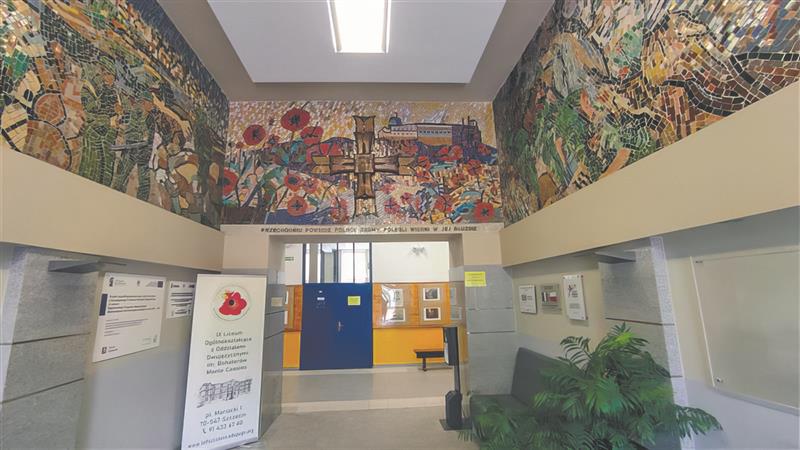 IX Liceum Ogólnokształcące z Oddziałami Dwujęzycznymi im. Bohaterów Monte Cassino w Szczecinie ma bogatą historię sięgającą aż drugiej połowy trzynastego wieku. Nie ma jednak wątpliwości jakiemu wydarzeniu składa szczególny hołd. Już na wejściu spotykamy się z mozaiką autorstwa Wieńczysława Mazusia i Danuty Strzelbickiej-Mazuś, która pozbawia nas wszelkich wątpliwości i przekazuje jasną wiadomość – to liceum znajduje się pod zaszczytnym patronatem Bohaterów Monte Cassino. Znaku tego nie da się przeoczyć, niezwykłe dzieło sztuki skutecznie przykuwa uwagę, a jest to dopiero początek honorowania patronatu przez społeczność szkoły.