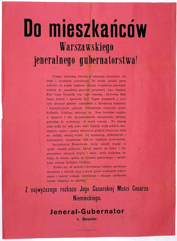 W pierwszym roku wojny samozwańczy „wyzwoliciele” Warszawy nie mieli w zasadzie żadnego realnego planu co zrobić ze zdobytymi terenami. Koncepcja taka nie została zresztą sformułowana przed wojną z prostego powodu – Niemcy były zainteresowane aneksjami na zachodzie, armia rosyjska miała zostać szybko rozbita i zmuszona do zawarcia pokoju. Z tego też względu Niemcy nie mieli kontaktów w zasadzie z żadną poważną polską frakcją polityczną. Związane z cesarsko-królewskim wywiadem i złożone w dużej mierze z „elementu socjalistycznego” Legiony nie budziły ich zaufania. Nie były też w oczach niemieckich oficerów prawdziwym wojskiem, a raczej rozpolitykowaną „cywil‑bandą”.