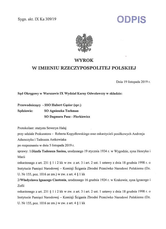 Dzięki staraniom prok. IPN Mieczysława Góry 5 czerwca 2012 r. przed Wojskowym Sądem Okręgowym w Warszawie rozpoczął się proces gen. Floriana Siwickiego, gen. Władysława Ciastonia i gen. Józefa Sasina. Generał Siwicki jeszcze w tym samym roku, z uwagi na zły stan zdrowia, został wyłączony z procesu, zmarł w 2013 r. Przełomowy wyrok zapadł 22 lutego 2018 r. Sąd Rejonowy dla Warszawy‑Mokotowa uznał generałów Ciastonia i Sasina za winnych represjonowania opozycjonistów i skazał ich na dwa lata pozbawienia wolności, kwalifikując ich czyny jako zbrodnie komunistyczne stanowiące zbrodnie przeciwko ludzkości. Z uwagi na wiek i stan zdrowia nie trafili do więzienia, obaj zmarli w czerwcu 2021 r.