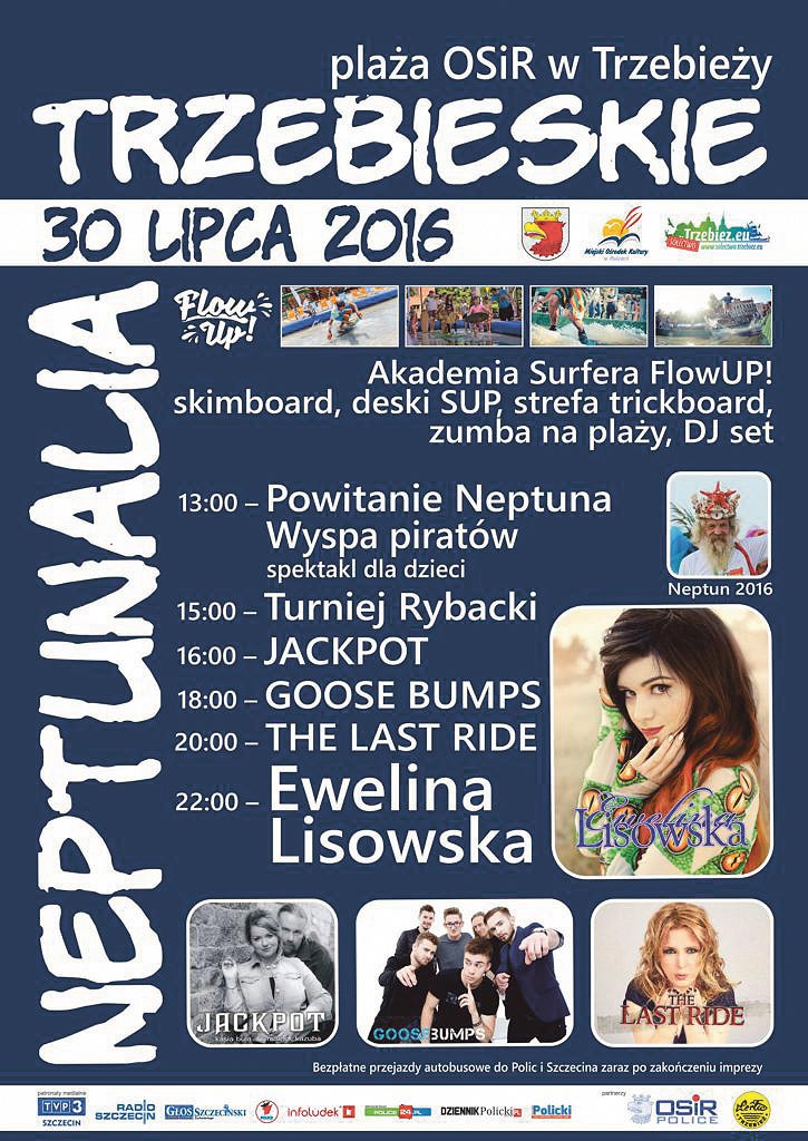 Tegoroczne Neptunalia odbędą się 30 lipca 2016. Impreza zostanie zorganizowana na plaży przy OSIR w Trzebieży. Podczas imprezy organizatorzy zaplanowali wiele atrakcji, m.in. uroczyste powitanie Neptuna, Polsko‑Niemiecki Turniej Rybacki, program dla dzieci oraz koncerty zespołów muzycznych: Ewelina Lisowska, Jackpot, Last Ride, Goose Bumps.