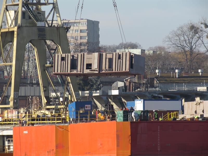 W sobotę (17 listopada) na ponton „Carrier 7” załadowano sześć bloków, które teraz popłyną do stoczni niemieckiej.